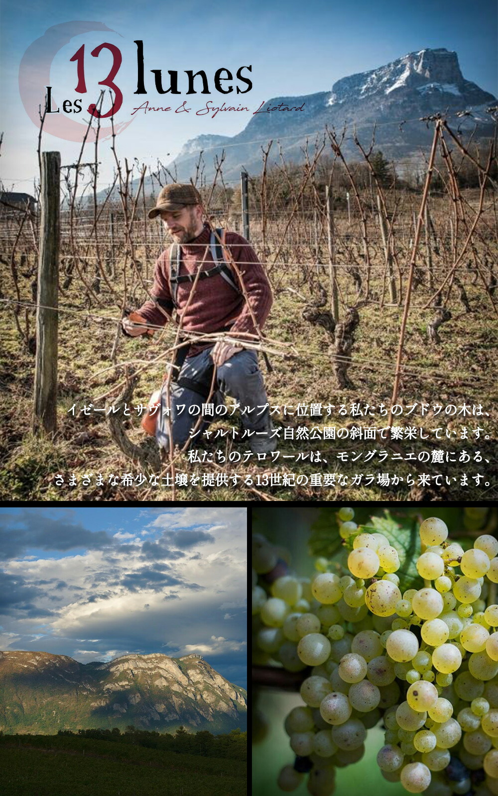 グラニエ山麓のシャパレイヤン村に2016年に創業した、超新星自然派ドメーヌです。 継承する畑を持たなかったシルヴァン・リオタールは、DRCやルフレーヴらにビオディナミを伝授した巨匠ピエール・マッソンの実子にして後継者、ヴァンサン・マッソンにビオディナミを師事した後、錚々たるアペラシオンの古畑畑を購入する幸運に恵まれ、「ドメーヌ・デ・トレーズ・リュンヌ」を設立しました。 「13の月というドメーヌ名も、ビオディナミの基本となる月の運行に由来しています。大地、海、そして動植物の活動は月のリズムに連動しており、私のすべての仕事もこのリズムに対応させています」。合計5.65ヘクタールの畑にはジャケール、アルテス、モンドゥーズといったサヴォワ主要品種の古樹が輝き、「クリュ・アプルモン」「クリュ・アビーム」「ルーセット・ド・サヴォワ」といったフラッグシップ以外にも、意趣あふれるラインナップを展開しています。 51軒ものミシュラン星付きレストランを抱えるフランスきっての美食の地サヴォワにあって、彼のワインはファーストヴィンテージから大きな話題となり、3つ星「フロコン・ド・セル」を筆頭に多数のレストランのワインリストを飾っています。 偉大なヴィニュロンのオーラを早くも纏いはじめている彼のワインは、豊潤にして深奥。サヴォワ特有の控えめなアルコール度数も相まって、日常の食事から究極的美食まで、純然たるマリアージュの悦びを提供してくれます。 | ![]() ■ぶどう品種:ジャケール100% ■発酵・熟成:ステンレスタンクで3週間のマセラシオン発酵後、80%はステンレスタンク、20%は228リットルの新樽でマロラクティック発酵&10ヶ月間熟成 ■樹齢:約70年 入手困難!フランス・サヴォワ地方から人気辛口オレンジワイン!サヴォワ・ジャケール種100%の辛口オレンジワイン愛好家大注目! 自然派・ビオディナミの方法で栽培されており、「AB」認証と「demeter」認証を受けていることが特徴。痩せた粘土石灰質の土壌で育ち、0.2haの小さな畑からは、限られた収量のみが生産される。このオレンジワインは、ステンレスタンクで3週間のマセラシオン発酵を施し、その後80%はステンレスタンクで、20%は228リットルの新樽でマロラクティック発酵と10ヶ月間の熟成を経て完成する。「私に月を見せて」と名付けられたこの作品は、ミネラル感と華やかな香り、豊かな果実味が特徴。 イゼールのグレジヴォーダン渓谷で生産されるこのオレンジワインは、サヴォワ地方の土着品種であるジャケールを使用しており、サヴォワのイゼールの美しい自然の中で育まれた、非常にユニークで希少価値の高い一本となっている。 |