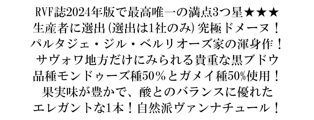 【商品名】ビビ 2022 ドメーヌ パルタジェ ジル ベルリオーズ元詰 自然派 フランス ジュラ サヴォワ地方 ロウ封印キャップ 赤 辛口 ライトボディ 【英名】BIBI 2022 Domaine Partage - Gilles Berlioz AOC Vin De Savoie Biodynamique (2022 Domaine Partage Gilles Berlioz Cuvee Bibi Vin de Savoie , France) 【商品説明】フランス・サヴォワ地方から人気辛口赤ワイン愛好家大注目!ヴァン・ド・サヴォワAOC愛好家大注目!サヴォワ地方だけにみられる貴重な黒ブドウ品種モンドゥーズ種50%とガメイ種50%で造られる辛口赤ワイン!レヴュ・デュ・ヴァン・ド・フランス(RVF)誌2024年版で最高唯一の満点3つ星★★★生産者に選出(選出は1社のみ)の究極ドメーヌ!パルタジェ・ジル・ベルリオーズ家!現地のライターのコメントは『工場労働者の息子であるジル・ベルリオーズは、独学でワイン造りを始めた。造園家として訓練を受けた彼は、1990年にパートナーのクリスティーヌに手伝ってもらい、シニャン地区で0.8ヘクタールから始めた。現在は4.5ヘクタールを所有し、馬の助けを借りて耕し、2005年に有機農法に転換、その後ビオディナミ農法に移行した(認証は受けていない)。シンプルなシニャンからモンドゥーズまで、そして区画選択によって醸造された特別なシニャン・ベルゴンも忘れてはならない。すべてのワインが模範的な表現を示している。経験豊かな愛好家たちが、数量限定のこの金細工師のワインを買い求めている。地域全体と世代全体に道を示した、欠かすことのできないアドレスである。』と絶賛!1990年にジル・ベルリオーズによって設立!ドメーヌ名のパルタジェは、一緒に働く人々と想いをシェアするという意味で後から付け加えられました!機械は一切使用せず、人と馬の力のみでブドウを育てています!キュヴェ名は当主であるジルのあだ名に由来!2020年が初ヴィンテージで3回目のヴィンテージ!しかもこのビビ[2022]年・ドメーヌ パルタジェ・ジル・ベルリオーズ元詰でRVF誌2024年版唯一の満点3つ星★★★生産者に選出の快挙!しかもこの2022年のビビで89点獲得!果実味が豊かで、酸とのバランスに優れたエレガントな一本!ガメイ50%、モンドゥーズ50%!キュヴェ名は当主であるジルのあだ名に由来しています!赤い果実、スミレ、コショウ、黒鉛のキャラクター、料理との相性 スパイシーなマグロとサーモンの巻き寿司等、果実味が豊かで、酸とのバランスに優れたエレガントな一本です!もちろん現地のセラー数ヶ月前の蔵出し作品で限定少量入荷! 【タイプ】赤・辛口 【テイスト】ライトボディ 【生産年】[2022]年 【生産者】ドメーヌ パルタジェ ジル ベルリオーズ元詰 【生産地】フランス/サヴォワ/AOCヴァン・ド・サヴォワ・モンドゥーズ 【品種/セパージュ アッサンブラージュ】ガメイ種50%、モンドゥーズ種50% 【内容量】750ml 【注意文】4573542514022 【JANコード】0110001002979