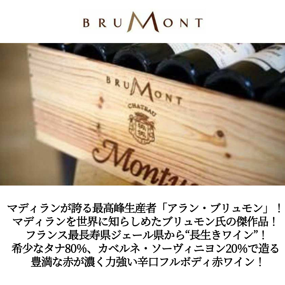 【商品説明】フランス・フルボディ辛口赤ワイン愛好家大注目!フランス南西地方 (シュッド・ウエスト) 愛好家垂涎!あのハリウッド・スター、トム・クルーズが愛飲し、多くの三つ星レストラン御用達で世界一のソムリエが認めたワイン!過去、エールフランスのビジネスクラスでもオンリスト!マディラン最高峰生産者「アラン・ブリュモン」!フランス最長寿県”ジェール県”から”長生きワイン”!希少なタナ80%、カベルネ・ソーヴィニヨン20%で造られる豊満な赤が濃く力強いフルボディ赤ワインとして有名なマディラン!ワイン評論家のヒュー・ジョンソン氏は「タナ種をベースにつくる豊満な赤!」★★~★★★3つ星評価! 造り手は「南西地方のペトリュス」「テロワールの天才」の異名をとる、マディランワインの復活に全人生を懸け、タナ種で世界を震撼させたマディランの名士!1991年フィガロ誌にて最高生産者として選出され、1997年にはナポレオン1世により制定されたフランス最高の勲章であるレジョン・ドヌールを授与されたアラン・ブリュモン氏!「私の務めはテロワールに自らを語らせること。新たな味わいを作り出すのに必要な素材は、全てこの地に揃っているのだから。私はただテロワールの個性を引き出し、全体の調和を図っているに過ぎない。」とテロワールを反映したワイン造りにこだわり、その高いポテンシャルを世界に発信し続けるドメーヌ・アラン・ブリュモン!ずばりマディランを世界に知らしめたブリュモン氏の傑作品であり、看板ワインである究極シャトー・モンテュス! 粘土質、石灰質に小石 (大きなものも混在) の混じった急斜面の畑からの樹齢25年のタナ種80%とカベルネ・ソーヴィニヨン20%を60%新樽で、40%を1年使用樽にて12~14ヶ月で造られる究極フルボディ辛口赤ワイン!この2021年の評価はまだですが、2019年でワインアドヴォケイト誌驚異の94点で、コメントは「2019年のシャトー・モンチュスは、この土地の進化したスタイルを示しており、2016年のものよりも抽出を増やすことなく、より濃密で真面目さを示している。ローム質の土壌、ブルーベリー、桑の実、スパイス、鉛筆の芯のアロマに続き、まろやかで包み込まれるようなチャーミングな味わいで、果実の芯が幾重にも重なり、ビロードのように滑らかで浸透力のある長い余韻が続く。タナ80%、カベルネ・フラン20%のブレンドで、粘土質土壌のまろやかさと肉付きの良さを表現している。この先10年、そしてそれ以上熟成させる。」と激賞! 熟した黒い果実、黒胡椒、ナツメグ、コーヒーなどのアロマ!非常に濃厚で力に満ち、甘みを感じる程、まろやかで、滑らかな味わい!ブラックベリー、プラムの凝縮感にスパイスが豊かに広がり、また、緻密で芳醇なタンニンが、上品に感じられる素晴らしい出来映えのアルコール度数15%を誇る究極マディラン!大人気シャトー・モンテュスが飲み頃5年熟成で遂に少量入荷!