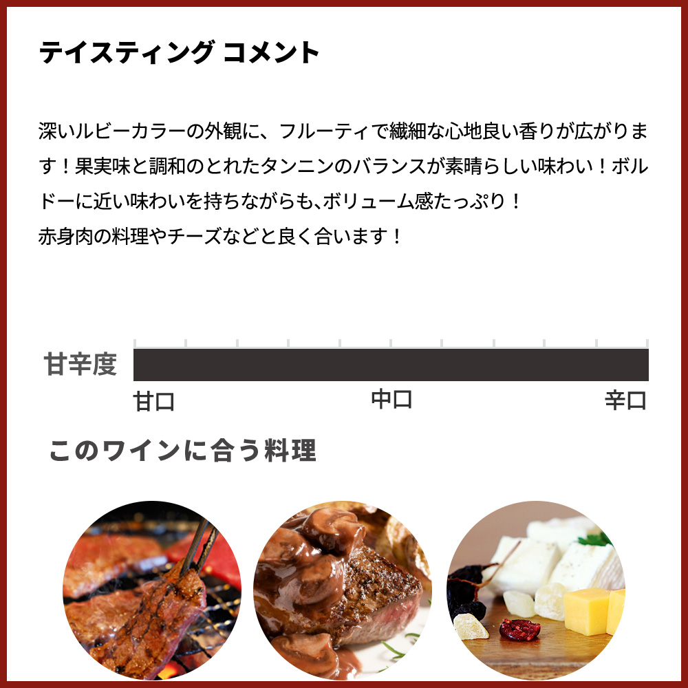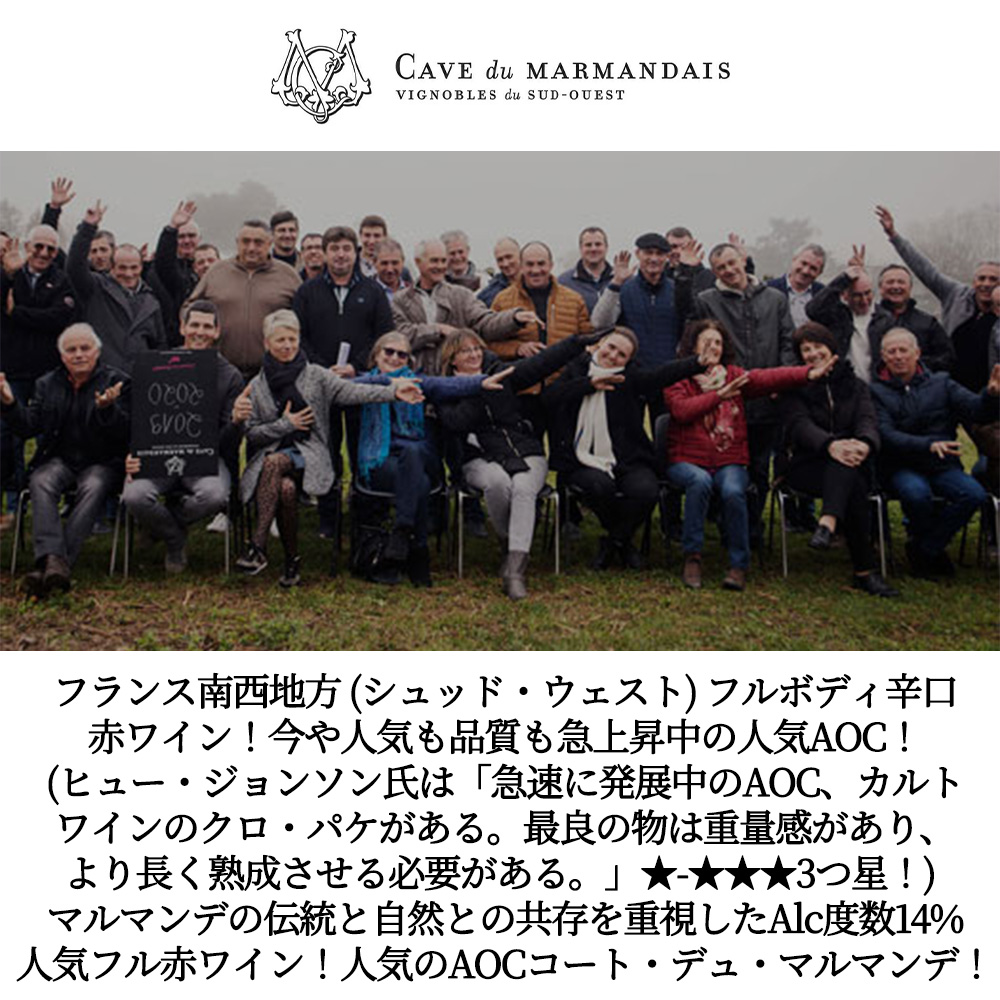 【商品説明】南フランス フルボディ辛口赤ワイン愛好家大注目!フランス南西地方 (シュッド・ウェスト) フルボディ辛口赤ワイン愛好家大注目!今や人気も品質も急上昇中の人気AOC!しかもジルベール&ガイアール2025年版ゴールドメダル (金賞) 受賞酒&70 Millions de Degustateurs ゴールドメダル (金賞) 受賞酒のダブルWゴールドメダル受賞酒! しかも造り手は、フランスワイン権威評価誌“アシェット・ガイド誌”でほぼ毎年掲載!2026年版ではシャトー・ルソー・パラールが満点3スター★★★&ハートマーク・クープドクール (ハートに一撃) 獲得!ル・プールプ・マジックがW★★スター獲得で5銘柄が掲載!AOPコート・デュ・マルマンデ最大の協同組合 (なんとAOPコート・デュ・マルマンデの95%を占める) の元詰ワイン!カーヴ・デュ・マルマンデによる、マルマンデの伝統と自然との共存を重視した人気赤ワイン!しかもAOCコート・デュ・マルマンデについてヒュー・ジョンソン氏は「急速に発展中のAOC、カルトワインのクロ・パケがある。最良の物は重量感があり、より長く熟成させる必要がある。」★-★★★3つ星と大注目!しかも一度は絶滅の危機に瀕したブドウ品種を地方の栽培家の努力により、この地の代表品種として評価されるようになったアブリュ種をはじめ伝統的なボルドー品種であるメルロー、カベルネ・フラン、カベルネ・ソーヴィニヨン、マルベックで造られるフルボディ辛口赤ワイン! 深いルビーカラーの外観に、フルーティで繊細な心地良い香りが広がります!果実味と調和のとれたタンニンのバランスが素晴らしい味わい!ボルドーに近い味わいを持ちながらも、ボリューム感たっぷり!赤身肉の料理やチーズなどと良く合います!フランス南西地方からの極旨フルボディ辛口赤ワインが満点3スター★★★&ハートマーク・クープドクール (ハートに一撃) 獲得!で限定で少量入荷!