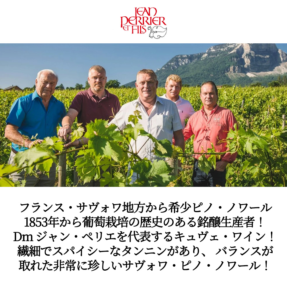 【商品説明】フランス・サヴォワ地方からピノ・ノワール100%辛口赤ワイン!サヴォワ愛好家大注目!ピノ・ノワール愛好家大注目!現在サヴォワ地方では約23種のぶどう品種を栽培しており、3つのAOC地区(ヴァン・ド・サヴォワ・シニャン、ヴァン・ド・サヴォワ・アプルモン、ヴァン・ド・サヴォワ・ジョンジュー)を含む全20のブドウ生産地区から成り立っています!しかも珍しいサヴォワのピノ・ノワール100%辛口赤ワイン! 造り手は1853年、カセラン・ペリエ氏が、サンタンドレ・レ・マルシェにセラーを購入しモン・グラニエの山の麓で葡萄栽培を開始!その後、引き継いだ息子のクロード=エミリー・ペリエ氏は新たにセラーを購入し、フィロキセラ禍で失われた葡萄畑を再開!葡萄栽培者であり営業でもあった彼は、造ったワインを騾馬にひかせてカフェの店主たちへと売り歩いきました!1920年クロード=エミリーの息子ジャン・ペリエ氏が引き継ぐと、葡萄畑とセラーを拡張し、その後ジャンの息子、ジャン=ヴィクトール・ペリエ氏時代には、サヴォワで最初にボトル売りをするワイン生産者となりました!1964年、ジャン=ヴィクトールの息子であり、現オーナーのジルベール・ペリエ氏が引き継ぐと、ボトリングラインに投資を行い、1時間あたり2,000本のワインがボトリング可能となり、生産量が増えました!その後もワイナリーに意欲的と投資を行い現在は1時間あたり6,000本ボトリング可能な設備を所有!現在は、ジルベールの息子3人、フィリップ、クリストフ、ジレが中心となってワイン造りを行うドメーヌ・ジャン・ペリエ・エ・フィスによる究極サヴォワ・ピノ・ノワール! ずばり造り手を代表するキュヴェ・ガストロノミー!このワインはショターニュとジョンジューといったブルジェ湖の北側だけでなく、サヴォワ峡谷の畑からの厳選ピノ・ノワール100%(手摘み収穫)を空気圧プレスで圧搾し、20℃に温度管理されたタンクでデブルバージュ!3週間発酵!熟成はステンレスタンクで4~5ヶ月!瓶詰後3ヶ月寝かせてからリリース!なんと!2021VTでは「ワインスペクテーター2021.10.15」90点獲得!! 明るいルビーレッド!レッドベリー、チェリー、ブラックベリーの香り!繊細でスパイシーなタンニンがあり、バランスが取れた非常に珍しいサヴォワ・ピノ・ノワール!究極フルボディ辛口赤ワインが限定で少量入荷!