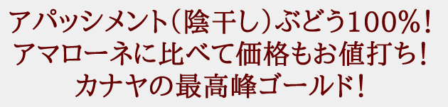 ![]() カナヤ セレツィオーネ ゴールド 2018年 ヴィッラ・アンナベルタ 良いものを選んで造った、極上のカナヤです。標高の高い、ヴェローナにごく近いガルダ湖の東岸にある畑で、北西向き。通常より遅い10月下旬に収穫しています。土壌は貧しく石が多いので、ワインが力強くしっかりしたものになります。葡萄は、40%水分が失われるまで、自然の空調を利用した部屋で乾燥させます。圧搾後、低温で5~6日間醸しをします。発酵は、2~3ヶ月続きます。これは温度が低いことと、陰干しにより自然の糖分が高いためです。熟成はバリックで24ヶ月行ないます。アマローネは通常プルーンの風味がありますが、このワインにはタバコの風味があり、より複雑さが出せています。当にアマローネそのもので、この価格はお値打ちです。 |