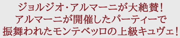 ![]() モンテリーベロ エチケッタ・オーロ ブラン・ド・ブラン ブリュットメトッド・クラシコに使用しているリザーブワインを加え、古木のブドウ果を使用し、複雑性に富んだ味わいに仕上げました。繊細でやわらかい泡、バナナやトーストされたヘーゼルナッツの香りが、ドライな味わいに心地よい風味を与えています。 ![]() |