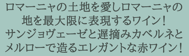 遅摘みしたカベルネとメルローを長期間マセラシオンし、サンジョヴェーゼとブレンド。バリック(小樽)で5ヶ月熟成させました。サンジョヴェーゼのフレッシュな果実味と、カベルネ・メルローからくる凝縮感のバランスが絶妙に調和しています。ブラックベリーのジャムを思わせる香り、豊かでまろやかな味わいときめ細かなタンニンのバランスが取れたエレガントなワインです。肉のローストや煮込み、グリル、熟成したチーズなどによく合います。
