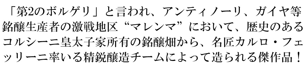 ![]() ビリッロ 2021年 ■ 葡萄品種:メルロー 、カベルネ・ソーヴィニヨン ■ 樹齢:12年(平均) ■ 土壌:砂質、シルト質 ■ 収穫:手摘み ■ 醗酵:ステンレス・タンク/主醗酵後、ステンレス・タンクにてマロ・ラクティック醗酵 ■ 熟成:オーク樽熟成 12ヶ月(225L) ■ タイプ:赤・フルボディ 飲みなれた口当たりは幅広いお客様に支持されており、なんといっても高いコストパフォーマンスが人気の秘密!かつて開拓不可能な湿地帯だと考えられてきた「マレンマ」地区!「第2のボルゲリ」と言われ、アンティノーリ、ガイヤ、オルネッライア等、銘醸生産者の激戦地区“マレンマ”において、歴史のあるコルシーニ皇太子家所有の銘醸畑から、名匠カルロ・フェッリーニ率いる精鋭醸造チームによって造られる、メルロとカベルネ・ソーヴィニヨンをオーク樽熟成12ヶ月で造られる究極フルボディ辛口赤ワイン! 深い色合い!ブルーベリーやプラム、コーヒー、スパイスの様々なアロマ!甘みのある豊かでシルキーなタンニンと口当たり、丸みのある味わいの究極フルボディ辛口赤ワインが限定少量入荷! ![]() |