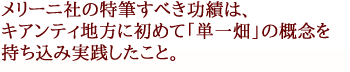 このメリーニ社の特筆すべき功績は、キアンティ地方に初めて「単一畑」(クリュ)の概念を持ち込み、実践したことです。それによって、全キアンティ・クラッシコの現在の名声の基礎が作られたのです。