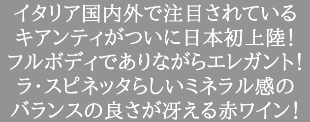 ![]() ラ・スピネッタ カサノーヴァ キアンティ・リゼルヴァ 2012年 野生の花やラズベリー、プラムの香り、フルボディでエレガント。ミネラル感のバランスの良さが感じられます。肉のグリルや、パスタなどとよく合います。 ![]() |