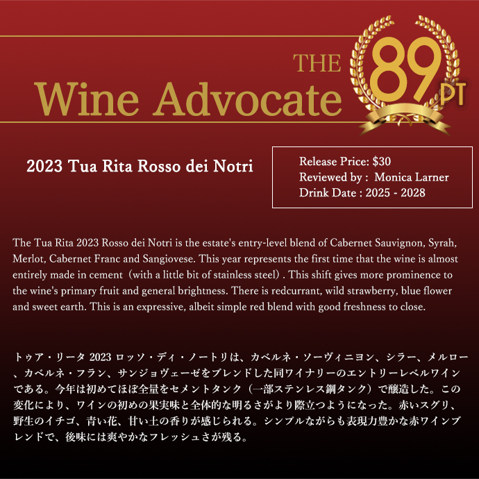 トゥア リータ ロッソ ディ ノートリ 2023 トゥア リータ元詰 ジェームス サックリング驚異93点&ワインアドヴォケイト89点 正規品 Rosso Dei Notri 2023 Az Ag Tua Rita