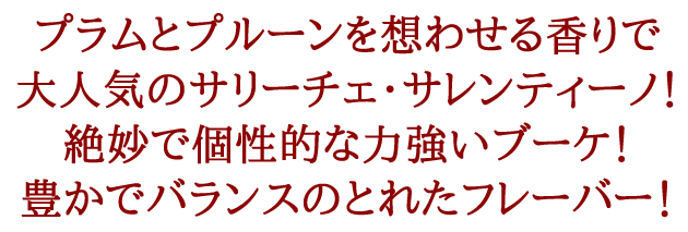 サレント地区にあるブドウ畑で、早朝収穫したブドウから造られる赤ワインです。ルビー色、エーテル香のある力強い香り、なめらかでバランスとれた味わいが特徴です。ルビー色。絶妙で個性的な力強いブーケ。アルコール感があり、ビロードのような舌触り。豊かでバランスのとれたフレーバー。