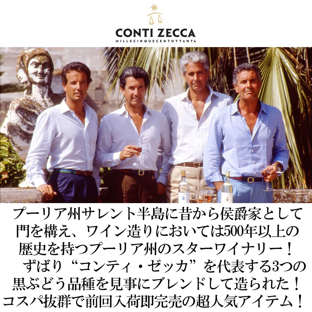 【商品説明】イタリア辛口フルボディ辛口赤ワイン愛好家大注目!前回、入荷後、即完売の超人気アイテム!当店でも大人気!プーリア州の老舗スターワイナリーの最新作で自信作が遂に登場!造り手は、南イタリアの土着品種の魅力を最大限に生かし、コストパフォーマンスに優れたワインを生み出す大人気の南イタリア名門ワイナリー!プーリア州サレント半島に昔から侯爵家として門を構え、ワイン造りにおいては500年以上の歴史を持つゼッカ家!現在のワイナリーは現当主の祖父アルチビアテ・ゼッカ氏によって1935年設立!ガンベロ・ロッソ誌でトレ・ビッキエーリを10回獲得したスターワイナリーは、プーリア州でこのコンティ・ゼッカを含む3ワイナリーのみで、その中でもパイオニア的存在のワイナリーが名門コンティ・ゼッカ!造り手を代表し造り手が最も得意とする3つの黒ぶどう品種を見事にブレンドして造られた自信作!ネグロアマーロ45%にプリミティーヴォ45%、カベルネ・ソーヴィニヨン10%で造られるこの極旨赤ワイン!2018年もので『アジアワイントロフィー2019』で見事!ゴールドメダル・金賞受賞!さまざまな赤黒果実の香りが豊かに広がりジューシーなワイン!プラムやカシスのような果実感、タンニンは柔らかく熟れた印象!余韻が長く骨格もしっかりしているコストパフォーマンス抜群の南イタリア辛口赤ワインが待望入荷!