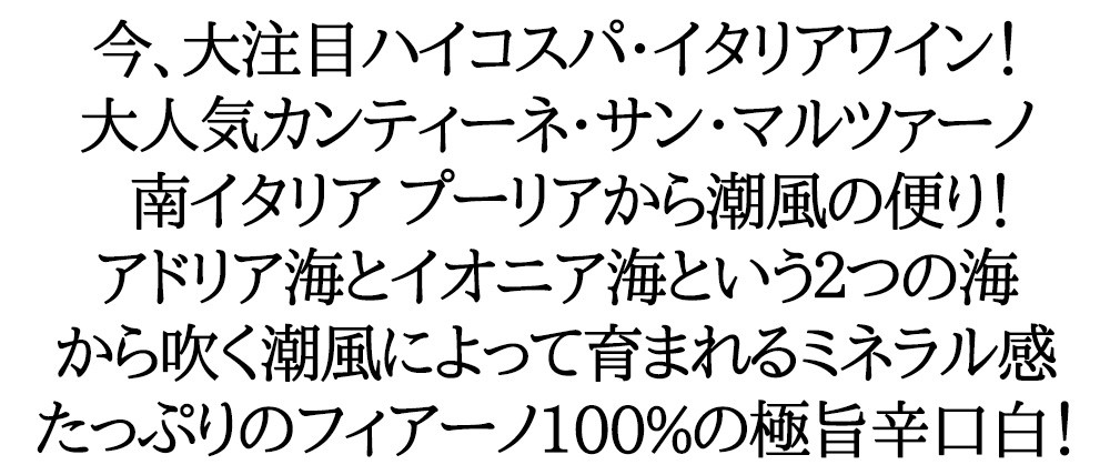 ![]() タロ・フィアーノ[2024]年 ■ぶどう品種:フィアーノ種100% アドリア海とイオニア海という2つの海から吹く潮風によって育まれるミネラル感たっぷりの極旨辛口白ワイン! 赤みがかった粘土石灰質からの樹齢約20年のフィアーノ種100%をフレッシュさを残すためステンレスタンクで造られた究極辛口白ワイン! 2018VTでAINアジアワインチャレンジ2019金賞受賞! 洋ナシやリンゴタルトといった爽やかさの中に香ばしさのあるアロマ! 心地よく伸びる果実味と潮風を想わせる程良いミネラル感が素晴らしい超極上イタリア辛口白ワイン! |