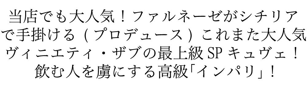 ![]() インパリ 2019年 ヴィニエティ・ザブ ザブの最上級キュヴェ。フィリッポ バッカラーロが惚れ込んで選んだ特別な畑からのネーロ ダーヴォラだけを使用しています。高樹齢なだけでなく、すべてのテロワールが理想的です。通常より長めのマセラシオンを行います。 熟成は、フレンチオークのバリックの(新樽70%、1年樽30%)で20ヶ月行います。マロラクティック発酵も樽で行います。ブレンドして瓶詰めした後、出荷前に18ヶ月以上瓶熟させます。濃いルビーレッド、スパイスの香りとブラックカラントやブルーベリー、そしてラズベリーのような赤い果実のアロマがあります。しっかりとした骨格、タンニンはおだやかで、持続性があります。名前もフィリッポが命名したもので、「incomparable=ずば抜けた、比類のない」という意味です。 |