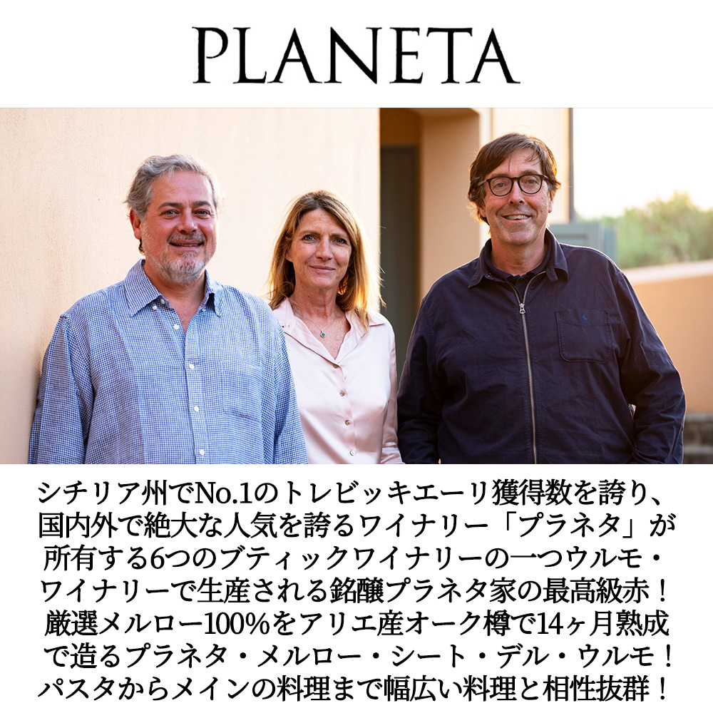 【商品説明】高級イタリア辛口赤ワイン愛好家大注目!レストランさまにも大人気アイテム!今や、シチリア州でNo.1のトレビッキエーリ獲得数を誇り、国内外で絶大な人気を誇るワイナリー「プラネタ」! プラネタ家とシチリアの歴史は15世紀まで遡るという非常に歴史ある生産者!15世紀にスペインより、シチリア西部のメソフィに移住してきた男爵家!5世紀もの間、17世代にわたり、プラネタ家は、シチリアの複雑な土地での農業進化に関わり、柔軟に革新的に取り組んできた名門!現オーナー世代の祖父にあたるヴィト・プラネタ氏は、小さな家族経営のワイナリーを大規模な協同組合のワイナリーへと変え、現オーナー世代の父にあたるディエゴ・プラネタ氏の経営の下で世界でも有数の協同組合に成長させ貢献! 「シチリアでも高品質なワインを造ることが出来る」とさらなる確信をしていたが、大規模な協同組合のワイナリーで共有し実現することはこれ以上、不可能だと思い、自分の家族「プラネタ家」として高品質なワインを造ることを決断!そして、プラネタ家が500年間農業を営んできた古い要塞に囲まれたウルモの土地で、今までの経験とアイデアの全てを結集させ、高い志のもと、ディエゴの娘フランチェスカ氏、従兄弟のアレッシオ氏とサンティ氏で新しく会社を設立するプロジェクトをスタート!1985年、最初のブドウ園をウルモに設け、“新生プラネタ”が誕生!今では5つの土地 (メンフィ-エトナまで) に6つのブティックワイナリーを所有する、「ガンベロ・ロッソ」でのトレビッキエーリ獲得数がシチリア州No.1となり名実共にシチリアを代表する造り手となったプラネタ家が誇る、愛好家に根強い人気を誇る赤ワイン! この「メルロー・シート・デル・ウルモ」は、6つのブティックワイナリーの一つウルモ・ワイナリーで生産されるプラネタ家の最高級赤ワイン!シチリア西部のサンブーカ・ディ・シチリア村にある畑 (海抜250メートルに位置) の超厳選メルロー100%をアリエ産オーク樽で14ヶ月熟成で造られる究極フルボディ辛口赤ワイン! 深く明るい紫色!熟した果実のアロマが、穏やかでエレガントなオークの香りと調和!濃く豊かな香りが優雅で複雑な味わいへと熟成していく可能性を予感させる!プラムやオークの香り豊かな味わいが長く続き、柔らかなタンニンが心地よい究極フルボディ辛口赤ワイン!パスタからメインの料理まで幅広い料理と相性抜群!プラネタ家が誇る高級赤ワイン“メルロー・シート・デル・ウルモ”が正規代理店輸入品で待望入荷!