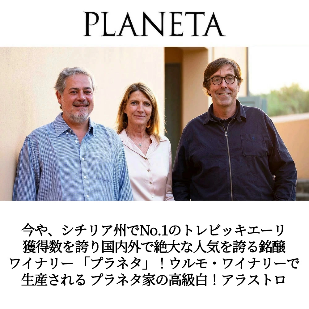【商品説明】高級イタリア辛口赤ワイン愛好家大注目!レストランさまにも大人気アイテム!今や、シチリア州でNo.1のトレビッキエーリ獲得数を誇り、国内外で絶大な人気を誇るワイナリー「プラネタ」! プラネタ家とシチリアの歴史は15世紀まで遡るという非常に歴史ある生産者!15世紀にスペインより、シチリア西部のメソフィに移住してきた男爵家!5世紀もの間、17世代にわたり、プラネタ家は、シチリアの複雑な土地での農業進化に関わり、柔軟に革新的に取り組んできた名門!現オーナー世代の祖父にあたるヴィト・プラネタ氏は、小さな家族経営のワイナリーを大規模な協同組合のワイナリーへと変え、現オーナー世代の父にあたるディエゴ・プラネタ氏の経営の下で世界でも有数の協同組合に成長させ貢献! 「シチリアでも高品質なワインを造ることが出来る」とさらなる確信をしていたが、大規模な協同組合のワイナリーで共有し実現することはこれ以上、不可能だと思い、自分の家族「プラネタ家」として高品質なワインを造ることを決断!そして、プラネタ家が500年間農業を営んできた古い要塞に囲まれたウルモの土地で、今までの経験とアイデアの全てを結集させ、高い志のもと、ディエゴの娘フランチェスカ氏、従兄弟のアレッシオ氏とサンティ氏で新しく会社を設立するプロジェクトをスタート!1985年、最初のブドウ園をウルモに設け、“新生プラネタ”が誕生!今では5つの土地(メンフィ~エトナまで)に6つのブティックワイナリーを所有する、「ガンベロ・ロッソ」でのトレビッキエーリ獲得数がシチリア州No.1となり名実共にシチリアを代表する造り手となったプラネタ家が誇る、愛好家に根強い人気を誇る白ワイン! この「プラネタ・アラストロ」は、6つのブティックワイナリーの一つウルモ・ワイナリーで生産されるプラネタ家の高級白ワイン!シチリア西部のサンブーカ・ディ・シチリア村にある畑(海抜250メートルに位置)の超厳選グレカニコ80%、ソーヴィニヨン・ブラン20%をソフトプレスした後、低温下でステンレスタンク内発酵!その後6ヶ月間シュールリー熟成! 熟したメロンや白桃の香り!ホワイトチョコレートのような甘い香りも感じさせる!ボリューム豊かで、とても柔らかな味わい!適度な酸味が新鮮さを高めてくれます!最後には思いかけずも、花を思わせるような香りが残るプラネタ家の高級白ワイン“アラストロ”が正規代理店輸入品で待望入荷!
