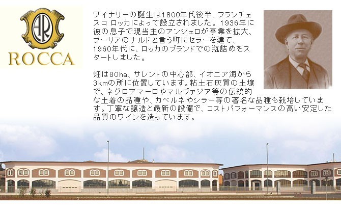 【生産者について】ワイナリーの誕生は1800年代後半、フランチェスコ ロッカによって設立されました。 1936年に彼の息子で現当主のアンジェロが事業を拡大、プーリアのナルドと言う町にセラーを建て、1960年代に、ロッカのブランドでの瓶詰めをスタートしました。_x000D_ _x000D_ _x000D_ 畑は80ha、サレントの中心部、イオニア海から3kmの所に位置しています。粘土石灰質の土壌で、ネグロアマーロやマルヴァジア等の伝統的な土着の品種や、カベルネやシラー等の著名な品種も栽培しています。_x000D_ _x000D_ _x000D_ 丁寧な醸造と最新の設備で、コストパフォーマンスの高