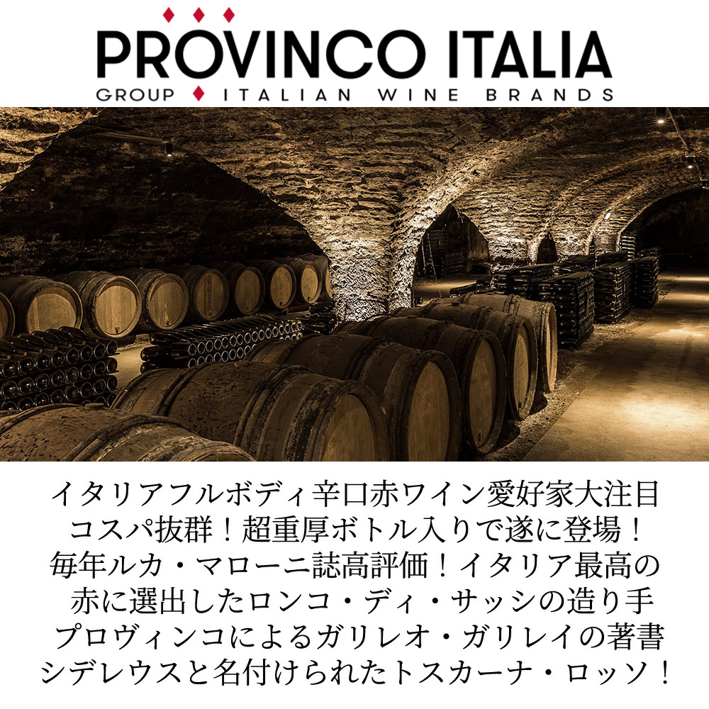 【商品説明】イタリア超フルボディ辛口赤ワイン愛好家大注目!濃厚赤ワイン愛好家必飲!ルカ・マローニ誌満点評価の快挙! イタリア最高の赤ワインに選出されたあのロンコ・ディ・サッシで有名な造り手!プロヴィンコは、本拠地をトレンティーノ州に構え、1970年代に醸造家の協同組合としてスタート!「品質第一」を目標にイタリア各地の上質なブドウやワインを探し求め高品質のワインをプロデュース!現在はワインの専門家や販売のプロによって運営されており世界20か国以上に輸出する大人気生産者プロヴィンコによる究極モダン・トスカーナワイン! 「その美しさ、明るさ、輝き、大きさ、荘厳さ...それはまるで満点の星空のよう...」ガリレオ・ガリレイの著書「シデレウス」と名付けられたトスカーナ・ロッソ!サン・ジョヴェーゼ70%にメルロー20%、カベルネ・ソーヴィニヨン10%をステンレスタンク発酵、ステンレスタンク&コンクリート・タンクにて4~6ヵ月熟成で造られた究極フルボディ辛口赤ワイン! シデレウス2017VTでルカ・マローニ誌驚異96点!スミレや熟したプラム、赤スグリの香りにスパイスの香りがほのかに広がる!凝縮したしっかりとした果実味に、それを支える酸味があるため、フルボディでありながらバランスの良い味わい!メルロー、シラー由来のアフターのタンニンが、長い余韻を演出しているコスパ抜群のイタリア辛口赤ワインが超重厚ボトルに入って遂に登場!