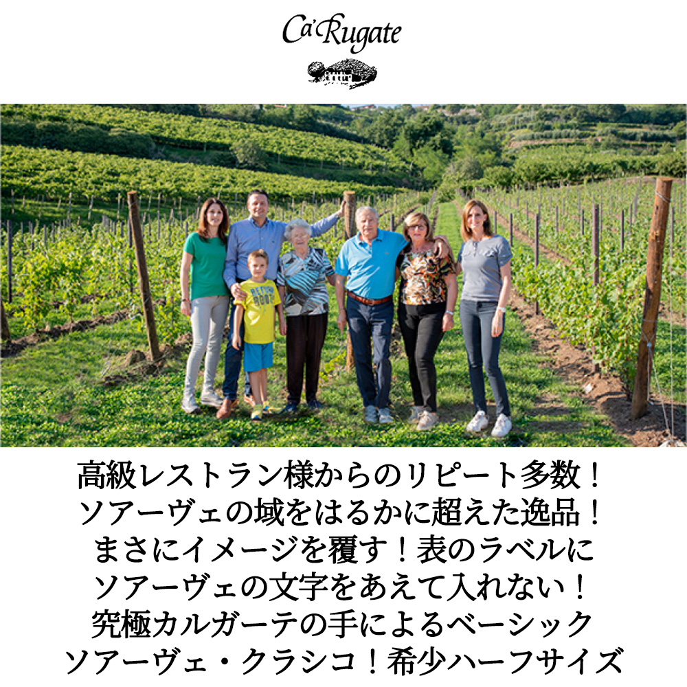 【商品説明】イタリア辛口白ワイン愛好家大注目!高級レストラン様からのリピート多数!ハーフサイズの人気ソアーヴェ!ソアーヴェの域をはるかに超えた!イメージを覆す!表のラベルにソアーヴェの文字をあえて入れない!こだわりの生産者!あのカ・ルガーテの手によるベーシック・ソアーヴェ・クラシコ! なんと2017年のソアーヴェ・クラッシコ・サン・ミケーレでガンベロ・ロッソ誌2019年版で2グラス(2ビッキエーリ獲得)インポーターさんいわく「シンプルで混じりけのないおいしさは、ピッツァ・マルゲリータのよう。」 北イタリアのヴェネト州で造られるガルガネガ種100%をステンレスタンクで8~12日発酵で造られるこのワインは、「緑色がかった輝きのある濃い麦わら色。最初はレモンのような柑橘系の爽やかな香りがありますが、次第に熟したフルーツや蜜のような凝縮感ある香りへと変化していきます。口中では、爽やかで生き生きとした酸味を感じ、アフターには少しビターな味わいが残ります。一般的ながぶ飲み用ワインのイメージとは対照的に、味わいの凝縮度が高く、さわやかなソアーヴェの特徴が感じられつつも、しっかりと味わえるスタイルとなっています。ベーシックなソアーヴェ・クラッシコとしてのライバルは、ほんの数えるほどでしょう。」 まさに究極の名にふさわしい大人気辛口ソアーヴェが正規品でしかもハーフサイズで限定入荷!