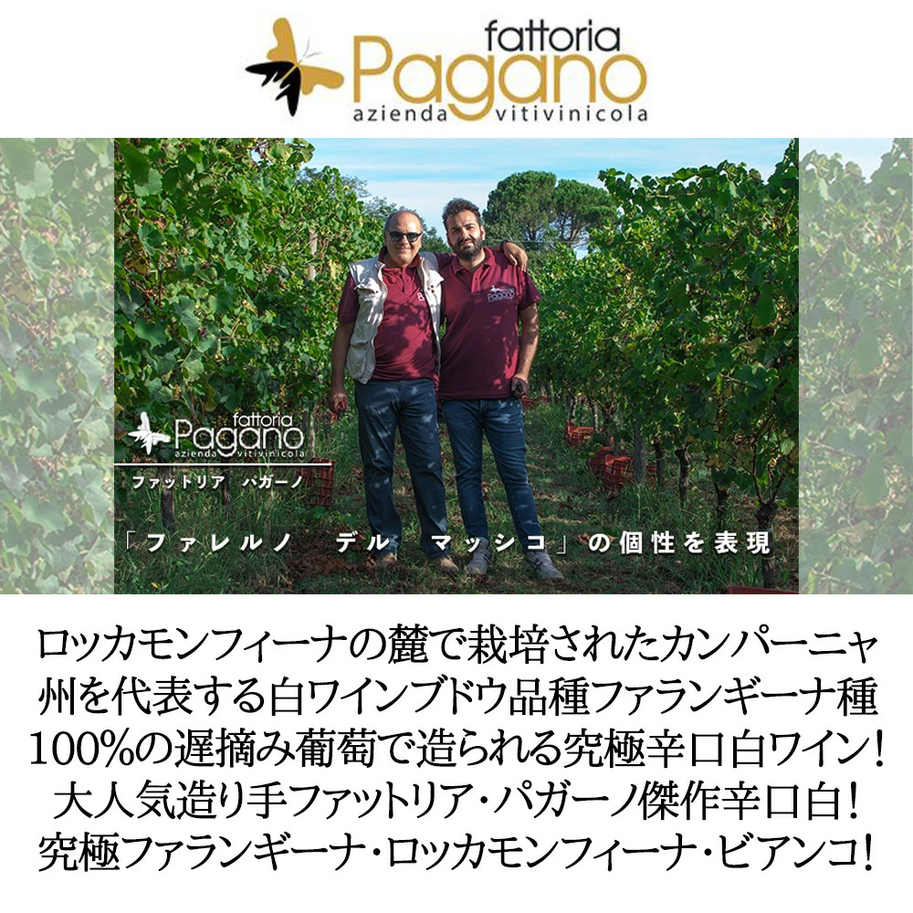 【商品説明】イタリア辛口白ワイン愛好家大注目!カンパーニア州からファランギーナ種100%で造られる人気辛口白ワイン!ロッカモンフィーナの麓で栽培されたカンパーニャ州を代表する白ワインブドウ品種ファランギーナ種100%で造られる究極辛口白ワイン! 造り手のファットリア・パガーノは、2001年にアントニオ・パガーノ家によって設立されました!公認会計士であるアントニオは、彼の土地への深い愛情をもっていました!この場所は、「ファレルノ」と呼ばれ、この地で産するワインは最高級のワインとして古代ローマの皇帝や貴族達にもてはやされ、また富の象徴とされていました!その後、歴史から消えてしまったファレルノのワインは、1970年代に弁護士で歴史研究家のフランチェスコ・パオロ・アヴァッローネとナポリ大学の研究者達の努力によって復活し、アントニオもぜひこの土地でワインを造りたいと願い、その夢を実現させました!現在は、アントニオの息子、アンジェロが中心となりワイン造りが行われています! 畑はロッカモンフィーナ火山の麓の斜面にあります!葡萄の仕立てはグイヨ、植栽密度5,200本/ha!通常よりも1週間から2週間ほど遅摘みにした葡萄から造られています!収穫は10月末から11月初旬に選別しながら手摘み100%で行います!この時期、葡萄は畑で乾燥した状態になっています!この凝縮された葡萄から深いアロマがもたらされます!発酵はステンレスタンクで行い、熟成もステンレスタンクで4ヶ月行います! 輝きのある麦わら色、白い花やハーブの豊かなアロマが広がります!繊細でエレガントな味わいをもつ大人気辛口白ワインが限定で少量入荷!