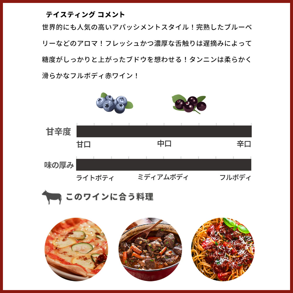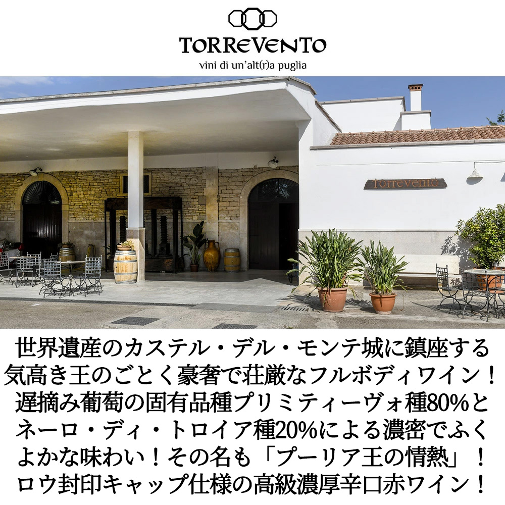 【商品説明】イタリア超フルボディ辛口赤ワイン愛好家大注目!濃厚赤ワイン愛好家必飲!イタリア・プーリア州から、固有品種プリミティーヴォ種80%とネーロ・ディ・トロイア種20%のブレンドで造られる超濃厚辛口赤ワイン! 世界遺産カステル・デル・モンテ城に鎮座する気高き王のごとく、豪奢で荘厳なワイン!遅摘み葡萄による濃密でふくよかな味わい! その名も「プーリア王の情熱」! 造り手は、プーリア州コラートとアンドリアにまたがるカステル・デル・モンテDOC指定地区の中心に位置するプーリア産ワインの品質向上を謳う旗頭トッレヴェント!ワイナリーの記録によると、現在の畑は1700年代には既に存在していたとあり、現オーナーであるフランチェスコ・リアントニオ氏がトッレヴェントと呼ばれる場所にあった修道院後を改装し、1989年ワイナリーをスタート!現在はプーリア州において最も評価の高いワイナリーのひとつとして大注目! このワインのコンセプトは「モンテ城は、当時の王フェデリコ2世の絶えぬ権力のシンボルとして建てられたと言われています。「石の王冠」とも例えられていたモンテ城は、見晴らしのいい高台に立っており、周囲の領民や敵族に畏敬の念を抱かされるほどだったとか。パッショーネ レアーレ (=王の情熱の意) はまさに、王の城に君臨する王そのものを表すワイン」! 遅摘みしたプリミティーヴォ種80%とネーロ・ディ・トロイア種20%をステンレスタンク8ヶ月熟成で造られるフルボディ辛口赤ワイン! この[2023]年でルカ・マローニ驚異の95点獲得! 遅摘みすることで自然に糖度をあげ、柔らかさと複雑さを備えたワインに仕上がります!世界的にも人気の高いアパッシメントスタイル!完熟したブルーベリーなどのアロマ!フレッシュかつ濃厚な舌触りは遅摘みによって糖度がしっかりと上がったブドウを想わせる!タンニンは柔らかく滑らかなフルボディ赤ワインがロウ封印キャップで限定で少量入荷!