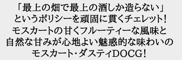 【商品説明】大人気イタリア産高級やや甘口微発泡(スパークリングワイン)ワイン愛好家大注目!レストランさまからのリピート多数!マスカット(モスカート)の甘くフルーティーな風味と自然な甘みが心地よい魅惑的な味わい!のモスカート・ダスティDOCG!!しかも珍しいハーフサイズ!造り手は、「最上の畑から最上の酒しかつくらない」というポリシーを頑固に貫く、イタリアワインの王様のバローロ(ブリッコ・ロッケ)で有名な名醸造所チェレット社!「伝統品種は繊細に、フランス系品種は力強く」のコンセプトの下にこのアスティ地区のモスカート種でもそれぞれの地区の代表とされる品質の高いワインを生産!!2013、2014年VTにワインスペクテーター誌高評価!で大注目!2009年V.Tのチェレット・モスカート・ダスティにワインアドヴォケイト誌も88点の高評価!標高300~400mの畑からの1976年、1994年、2010年植樹のホワイト・モスカート種100%(別名モスカート・カネッリ種)で造られる、アスティーDOCGと似ているが、より上質のモスカートから造られるアスティーよりアルコール度数が低く(5.5%)より甘口でフルーティーな大人気やや甘口微発泡ワインが限定で少量入荷!アペリティフにデザートワイン等々、TPOを選ばずお楽しみ頂けます。しかも正規代理店輸入品でしかも飲み切りハーフサイズで限定少量入荷!