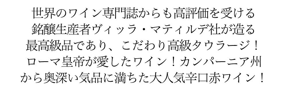 ![]() タウラージ フーゾネーロ 2015 数量限定輸入品 ヴィッラ マティルデ社元詰 DOCGタウラージ 正規品 750ml 赤 辛口 フルボディ ■ぶどう品種:アリアニコ種100% ■発酵・熟成:伝統的なオーク樽でマロラクティック発酵/35hlのオーク樽とバリックで18ヶ月熟成 イタリア・フルボディ辛口赤ワイン愛好家大注目!カンパーニア州の最も有名な赤ワインであり、イタリアの傑出したワインのひとつ!ローマ皇帝が愛したワイン! 幸多き大地!カンパーニア州から奥深い気品に満ちた大人気赤ワイン! テヌータ・ディ・アルタヴィッラの畑のアリアニコ種100%を伝統的なオーク樽でマロラクティック発酵!35hlのオーク樽とバリックで18ヶ月熟成で造られる、究極フルボディ辛口赤ワイン!リコリス(甘草)や赤や黒の森の果実がスミレの繊細な香りとともに感じられる!タンニンもバランスが良く、コクがあり、厳格で複雑な味わい! エレガントで長期熟成も可能な究極タウラージが正規代理店輸入品で限定少量入荷! |