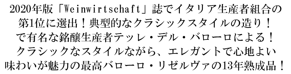 ![]() バローロ・リゼルヴァ[2013]年・テッレ・デル・バローロ・DOCGバローロ・リゼルヴァ ■ぶどう品種:ネッビオーロ種100% ■発酵・熟成:28~30度で、16~20日間発酵させます!62ヶ月の熟成の内18ヶ月以上は 25から50hL のフレンチオーク樽100%で熟成 ■土壌:石灰岩粘土 1958年の設立以来、常に高品質なバローロを手掛けてきたテッレ・デル・バローロ! 契約農家は、300軒を超え、葡萄畑は600haにも及びます! バローロを産出する11の村すべてに葡萄畑を持つ、唯一無二の生産者組合として知られています! 通常のバローロと同じく、いくつかの村のブレンドとなりますが、より地質年代が古い土壌の葡萄を使います!熟成による複雑な味わいがあり、クラシックなスタイルですが、エレガントさも備わっています! 程よいタンニン、リッチでバランスのとれた伝統的な高級バローロ! |