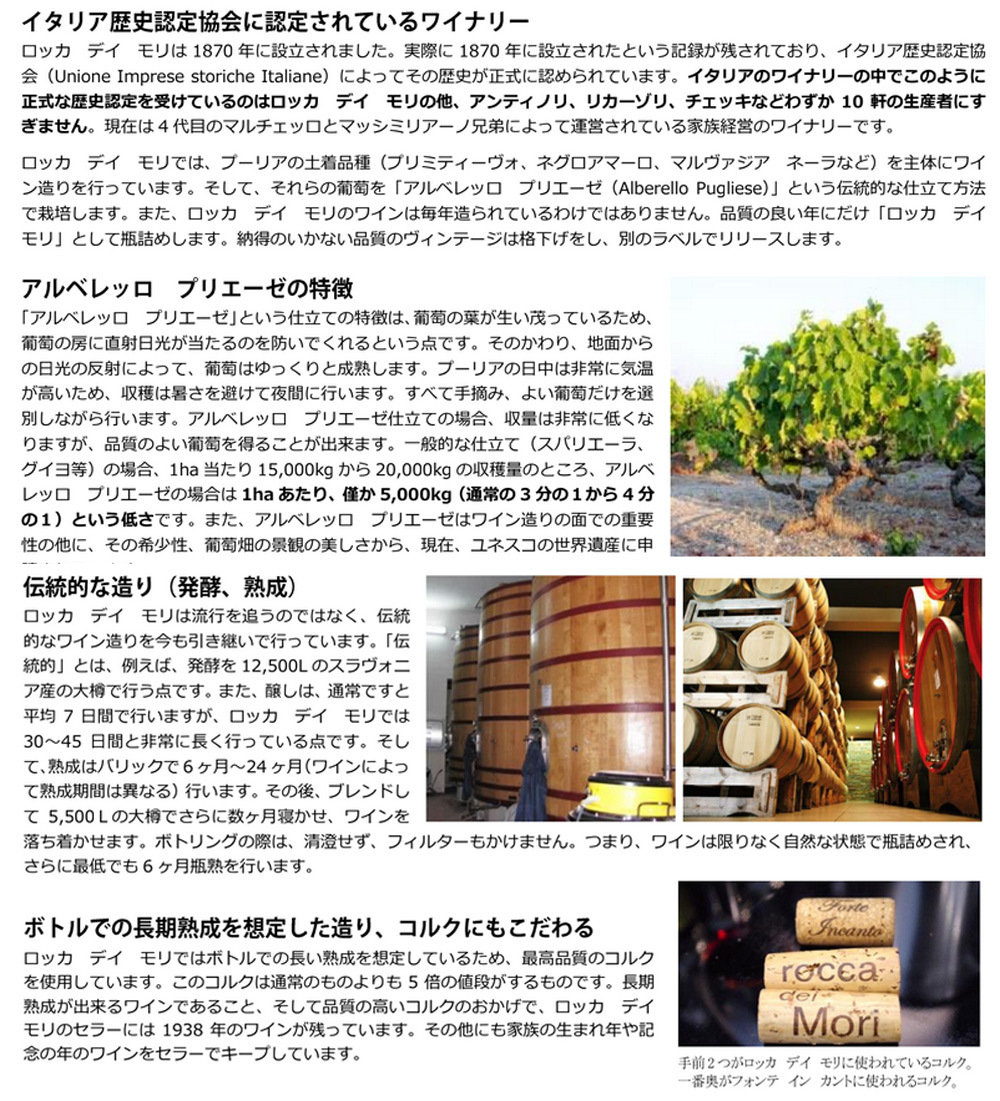 ![]() 「家族経営のワイナリー」 D.O.C.コペルティーノの中の、モンテローニ ディ レッチェにある全くの家族経営の生産者です。現在、兄が社長、弟がエノロゴで、この二人を中心に7名のスタッフで運営しています。 その年の作柄によって、造るアイテムを変えています。良いヴィンテージにしか上のクラスのワインは造りません。 ![]() 「重さではなく、畑の面積で葡萄を買い取り」 契約農家からは、単に葡萄を買うというより土地を借りて葡萄を造ってもらうというイメージで、1kg幾らではなく、1ha幾らという単位で買い取っています。葡萄は1本の枝に2~3房しか付けません。収穫は、夜中か早朝に100%手摘みで行い、良い葡萄のみ箱に入れます。 ![]() 「熟成可能なプーリアワイン」 ロッカ デイ モリのワインの特徴のひとつが、新しいヴィンテージへの切り替わりが比較的遅く、またワインの熟成がゆっくり進んでいるように感じられることです。熟成させて売ることはお金のかかることですが、ボトル熟成が重要だと思っているので、通常の5~10倍もする価格のコルクを使っています。コルクの色が良くないのは、漂白をしないためです。それも自分達を表現する方法のひとつだと考えています。「長いコルクは印象的でしょう?!」 長い発酵、熟成によっていろいろな力を溜め込むので、それをフィルターで除去することはしたくないと考えています。 |
