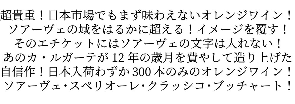 ソアーヴェ・スペリオーレ・クラッシコ・ブッチャート(オレンジワイン)[2021]年・カ・ルガーテ(ミケーレ・テサリ家)元詰・D.O.C.G.ソアーヴェ・スペリオーレ・クラッシコ・自然派・ビオ(ユーロリーフ認証)・400Lのセラミック容器熟成・日本入荷300本のみ・【白(オレンジ)・辛口】 ■土壌:火山性の玄武岩と粘土 日本への入荷数わずか300本のみのオレンジワイン!がついに入荷! 毎年のように「ガンベロ・ロッソ誌」で最高賞を受賞!ヒュー・ジョンソン「ポケットワインブック2019」でも、ヴァルポリチェッラの最良生産者に選出される、ソアーヴェとアマローネの一流生産者のカ・ルガーテ社によるオレンジワイン! 輝きのあるゴールデンイエロー!柑橘と地中海の様々なハーブの混ざる複雑で調和のとれたアロマが広がります!口に含むとミネラルの要素、深みと同時にエレガンスが感じられます!余韻には心地よいフレイバーが続きます! 超こだわりソアーヴェ・スペリオーレ・クラッシコ・ブッチャート(オレンジワイン)!