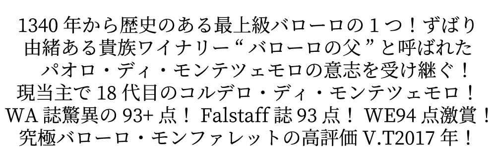 バローロ モンファレット 2017 蔵出し品 コルデロ ディ モンテツェモロ元詰 DOCGバローロ 自然派 ビオ ユーロリーフ認証 赤ワイン