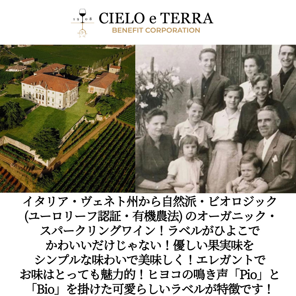 【商品説明】イタリア・ヴェネト州から自然派・ビオロジック (ユーロリーフ認証・有機農法) のオーガニック・スパークリングワイン愛好家大注目! ラベルがひよこでかわいいだけじゃない!優しい果実味をシンプルな味わいで美味しく!エレガントでお味はとっても魅力的! チェーロ・エ・テッラの歴史は1908年、ヴェローナの東、キャンポ渓谷の葡萄畑より始まりました!先代の3代目より瓶詰を始め、4代目となった現在、近代的な醸造設備の導入により更なる品質の発展を遂げました!現在、60ha以上もの自社畑にて、シャルドネ、メルローをはじめ、15種類以上の葡萄品種をCCPB (イタリア政府のオーガニック認定機関) の認証のもと、全てビオロジックにて栽培しております! 「BioBioシリーズ」はその名の通り「Bio=有機農法 (ビオロジック) 」で産み出されたワインです!ヒヨコの鳴き声「Pio」と「Bio」を掛けた可愛らしいラベルが特徴です! ガルガネガ種80%&インツォリア種20%をシャルマ方式で造られるドサージュ14g/Lで気圧:4.5バールの人気オーガニック・スプマンテ (スパークリングワイン) ! 淡いストローイエローの外観!青林檎やライムなどフレッシュな果実の香りに、フローラルなニュアンスも!口中では柔らかくクリーミーな泡が広がります!林檎や柑橘系の瑞々しい果実味、硬質な石灰質のミネラル!軽やかで飲み飽きない、これからの季節にピッタリの味わい! 大人気ビオ・ビオ・バブルスが待望入荷!