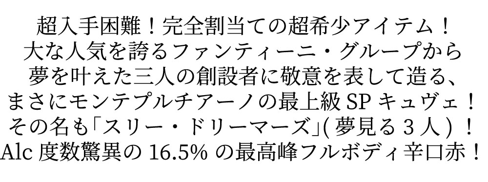 スリー ドリーマーズ 2020 (夢見る3人) ファンティーニ グループ (ファルネーゼ社) モンテプルチャーノ種100% 赤 辛口 750ml