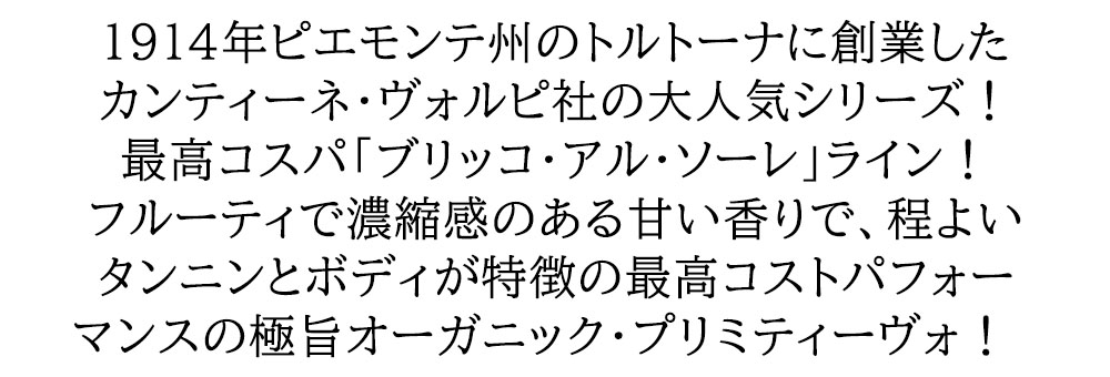 ブリッコ アル ソーレ プリミティーヴォ オーガニック 2024 カンティーネ ヴォルピ社 IGTプーリア オーガニックワイン Bricco al Sole Primitivo 2024 Cantine Volpi IGT Puglia
