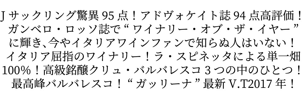バルバレスコ ヴィニェート ガッリーナ 2017 蔵出し品 単一畑100% スピネッタ社 DOCGバルバレスコ 赤 辛口 フルボディ 750ml ■ぶどう品種:ネッビオーロ種100% ■土壌:石灰質 ■樹齢:55~61年 ■発酵:温度調整可能なロータリー・ファーメンターで7~8日間/オーク樽でマロラクティック発酵 ■熟成:フレンチオークの一部新樽で18ヶ月以上熟成/ボトリング後さらに12ヶ月間瓶熟成 ネッビオーロ種100%で造るピエモンテの典型的な赤ワイン! ガンベロ・ロッソ誌で“ワイナリー・オブ・ザ・イヤー”に輝き、今やイタリアワインファンで知らぬ人はいない!イタリア屈指のワイナリー!ピエモンテの名門ラ・スピネッタ!によるによる力強さとエレガンスの極み!イタリアワイン愛好家垂涎! 名門スピネッタの人気の自社所有畑の3つのクリュ(単一畑)の一つ!(3種のバルバレスコは、すべてバリック(小樽)発酵、熟成!3つのクリュ(単一畑)の特徴をダイレクトに感じていただけます。)のクリュ・バルバレスコ「ガッリーナ」! ラ・スピネッタのバルバレスコの中で最も女性的で柔らかい味わいの“ガッリーナ”が、正規代理店輸入品で限定少量入荷!