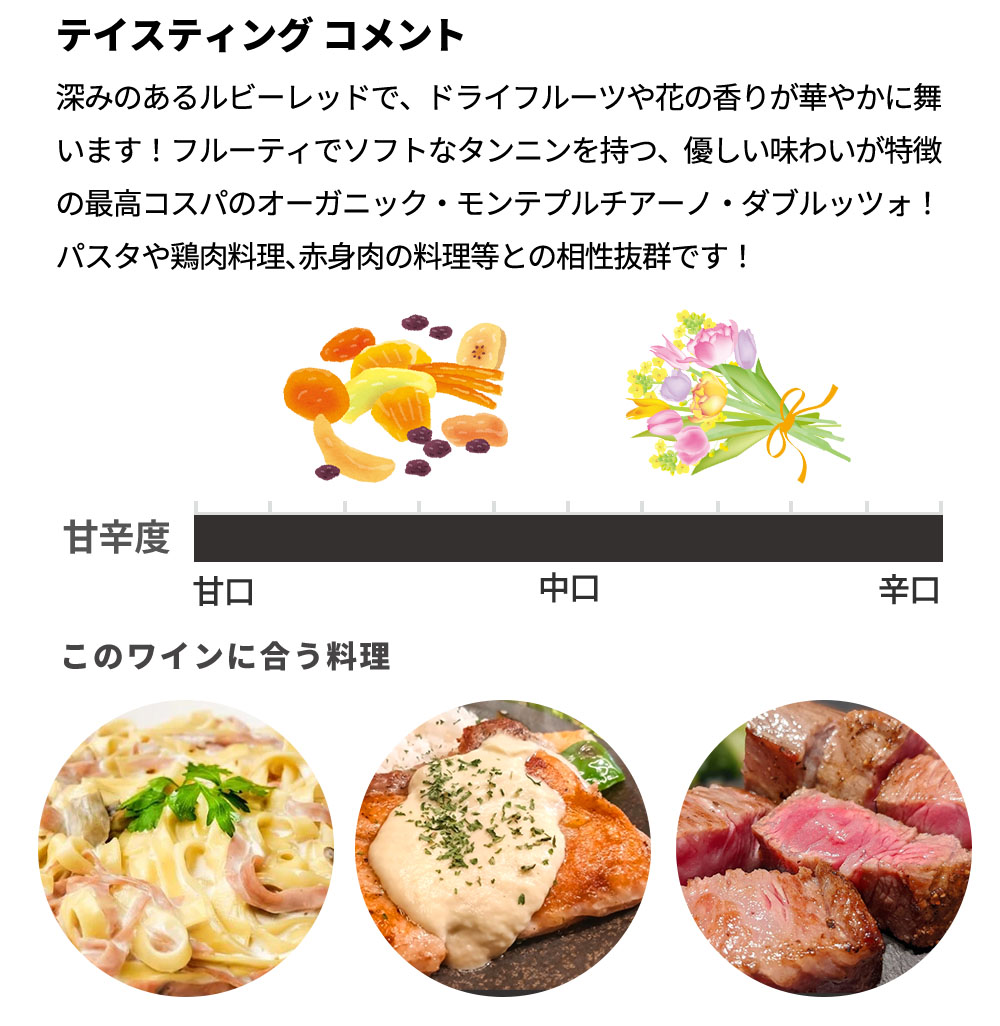 【商品説明】イタリア赤ワイン愛好家大注目!アドリア海に面したアブルッツォ州を代表する土着品種のモンテプルチアーノを使用したオーガニック辛口赤ワイン!造り手のカンティーネ・ヴォルピ社は、1914年ピエモンテ州のトルトーナに創業!現在は3代目のカルロ・ヴォルピ氏が経営を担っています!50年以上前から伝統的なワインを生産しており、20年ほど前に英国の大手コンサルタント会社であるボトルグリーン社と緊密に協力してオーガニックワイン製造プロジェクトを開始!カンティーネ・ヴォルピ社が手掛ける「ブリッコ・アル・ソーレ」ラインは、オーガニックワインの生産にかなりの知識と経験を有するオーストラリアと英国生まれのワインメーカーのチームで構成されており、ブドウ畑とワイナリーは、ヴェネト、マルケ、アブルッツォ、プーリア、シチリアの各地に所有!また、ワインの認証は、欧州連合(EU)の基準の遵守を保証するI.C.E.Aによって行われ、ブドウ畑、醸造プロセス、貯蔵およびボトリングなど生産の各段階において認定を受けています!すべてのワインは、完全に自動化されたボトリングラインのあるピエモンテ州トルトーナのワイナリーに集められ瓶詰!さまざまな地域から集積されるワインの貯蔵とロジスティックスにおいて効率的なトルトーナに施設をおくことで、最高品質を保証しています!最新鋭の技術と高い品質管理能力により、コストパフォーマンスに優れたワインを生産し、世界中のワイン愛好家から支持されています!このブリッコ・アル・ソーレ・モンテプルチアーノ・ダブルッツォ[2022]年は、アブルッツォ州の厳選モンテプルチアーノ・ダブルッツォ種100%を定温(25~27℃)で10~12日間で発酵、その後木樽で最低12ヶ月熟成後、ステンレスタンクで得12ヶ月間熟成!深みのあるルビーレッドで、ドライフルーツや花の香りが華やかに舞います!フルーティでソフトなタンニンを持つ、優しい味わいが特徴の最高コスパのオーガニック・モンテプルチアーノ・ダブルッツォ!パスタや鶏肉料理、赤身肉の料理等との相性抜群です!