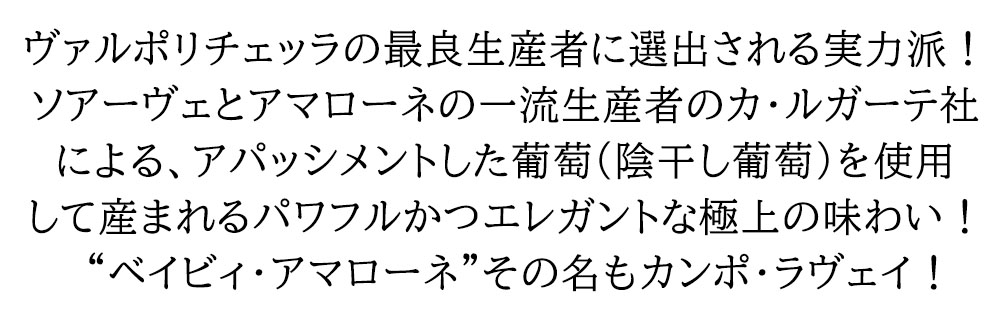 ヴァルポリチェッラ スペリオーレ カンポ ラヴェイ 2021 カ ルガーテ社 DOCヴァルポリチェッラ スペリオーレ ■発酵・熟成:乾燥させた葡萄を発酵させ、先に発酵させたワインとブレンドして12ヶ月バリックで熟成 ■土壌:粘土石灰質 高級レストランさまからのリピート多数!毎年のように「ガンベロ・ロッソ誌」で最高賞を受賞! ソアーヴェとアマローネの一流生産者のカ・ルガーテ社による、アパッシメントした葡萄(陰干し葡萄)を使用して産まれるパワフルかつエレガントな味わい!生産者曰く“ベイビィ アマローネ”!その名もカンポ・ラヴェイ!カンポは「草原」の意味で、畑のある丘陵地域を指します!単一畑からのワインです! まさに究極の名にふさわしい辛口フルボディ辛口赤ワインが限定で極少量入荷!