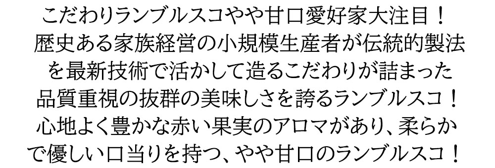 ![]() レッジャーノ ランブルスコ アマービレ フリッツァンテ アルフレード ベルトラーニ DOCランブルスコ アマービレ やや甘口 8.5% ■ぶどう品種:ランブルスコ・サラミーノ種70%、ランブルスコ・マラーニ種15%、アンチェロッタ種15% エミーリア・ロマーニャ州を代表するやや甘口赤スパークリング!こだわりランブルスコやや甘口愛好家大注目!歴史ある家族経営の小規模生産者が、伝統的製法を最新技術で活かして造る、こだわりが詰まった品質重視のランブルスコ!がついに入荷! 心地よく豊かな赤い果実のアロマがあり、柔らかで優しい口当たりを持つ、やや甘口のランブルスコ!優れた品質をもたらす丘陵地帯の畑からの葡萄を使用しています!ベースワインは伝統的な方法で温度コントロールしながら発酵させます! その後、二次発酵は大型の密閉タンクに入れシャルマ方式で行います!フィルターをかけて品質を安定させます!ボトリングシステムを蒸気で殺菌し、酸化を防ぐため空気に触れない状態で瓶詰めしています! 心地よい赤の果実のアロマが広がります!柔らかで優しい口当たり、アロマと同じ豊かな赤い果実のフレイバーが感じられるこだわりやや甘口ランブルスコ・アマービレが待望入荷! |