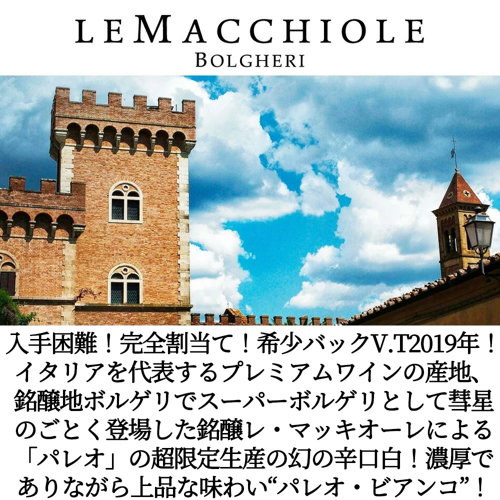 【商品説明】超入手困難!完全割り当て!極少量生産の超限定白ワイン!イタリア辛口白ワイン愛好家大注目!毎年、年産僅か3-5,000本の希少品!イタリアを代表するプレミアムワインの産地、銘醸地ボルゲリでスーパーボルゲリとして彗星のごとく登場した「レ・マッキオーレ」!あの「メッソリオ」「スクリオ」という世界レベルのワインを生み出し、ボルゲリの気候と大地、そして自身の可能性を信じて造り出した「パレオ」の超限定生産の幻の辛口白ワイン!その名も「パレオ・ビアンコ」!しかも希少なバックヴィンテージ[2019]年もの! この2019年は国際品種であるシャルドネ種70%にソーヴィニヨン・ブラン種30%をオーク樽で発酵後、オーク樽にてマロラクティック醗酵!その後フレンチオーク樽で7ヶ月熟成 (500L、300L、225L、新樽比率30%) 、瓶熟成10ヶ月以上でリリースされる希少白ワイン! この[2019]年でワインアドヴォケイト驚異の93点でコメントは「シャルドネとソーヴィニヨン・ブランのブレンドである2019年産パレオ・ビアンコは、トスカーナ海岸に期待される塩気のある海辺のニュアンスと鮮やかな果実味を美しく表現したワインだ。果実味は白桃とハネデューメロンを中心に、野生のセージ、砕けた石、そしてクミンとターメリックのほのかな香りが調和する。引き締まったスリムな口当たりで、中程度のボディ感の上にスパイシーな余韻が持続する。興味深いことに、このワインはアルト・アディジェのレポート執筆中に試飲したため、トスカーナワインとしてはやや柔らかな個性が特に印象に残りました。」! さらにRaffaele Vecchione94点でコメントは「魅惑的で次第に広がる香りは、ジャスミン、ヘリクリサム、乾燥カモミール、黄桃の香りを放ちます。ターメリックとジンジャーが主役を控えめに演じ、ジャスミンとバラの花びらと調和しています。豊かなボディと印象的な美しさを持つポリフェノール構造が、力強さと個性を兼ね備え、確かな飲み心地の良さを提供します。シャルドネとソーヴィニヨン・ブランのブレンド。」! 非常にリッチなトロピカルフルーツやナッツ、バニラのフレーヴァーが漂い、スパイシーな香りも広がる!濃厚でありながら上品な味わいの究極辛口白ワイン!“パレオ・ビアンコ”が希少なバックヴィンテージ[2019]年で正規代理店輸入品で当店入荷も、極少量割り当てで待望入荷!超限定入荷につき皆様ぜひお急ぎください!