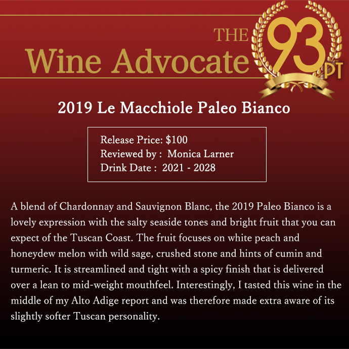 【商品名】パレオ・ビアンコ[2019]年・オーク樽7ヶ月熟成(新樽30%)・レ・マッキオーレ元詰・I.G.Tトスカーナ・ワインアドヴォケイト誌驚異93点高評価&Raffaele Vecchione94点【英名】PALEO Bianco 2019 Le Macchiole IGT Toscana Az. Agr. Le Macchiole
