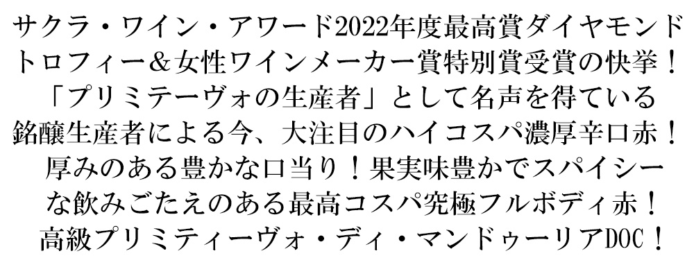 ![]() プリミティーヴォ ディ マンドゥーリア 2020 ノッテ ロッサ プリミティーヴォ種100% プリミティーヴォ ディ マンドゥーリアDOP 赤 辛口 ■ぶどう品種:プリミティーヴォ種100% ■発酵・熟成:オーク樽6ヶ月熟成(フランス産とアメリカ産225Lのバリックの小樽)/ステンレス・タンクにて9ヶ月熟成/さらに瓶熟2ヶ月以上 ■樹齢:樹齢約30年 ■土壌:粘土質土壌 イタリアレストランさまからの引き合い多数!今、大注目のハイコスパ・イタリア赤ワイン!深みのある色合いの、こくがあり、なめらかな赤で引き締まった酸と定評のプリミティーヴォ・ディ・マンデゥーリアDOC! 革新的な醸造技術によってブドウとテロワールの魅力を余すところなく表現したワインは、世界中で大人気!プーリア州サレントにあるNOTTE ROSSA(ノッテ・ロッサ)は、ワイン業界で主要生産者の一つであり、イタリアだけでなく国際市場にも浸透しています。 特に、プリミテーヴォから造られるワインにおいて、世界で評価が高く、「プリミテーヴォの生産者」として名声を得ています。!プリミティーヴォ種100%のみから造られる、この地方を代表する赤ワインです! |