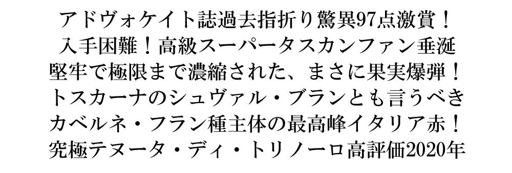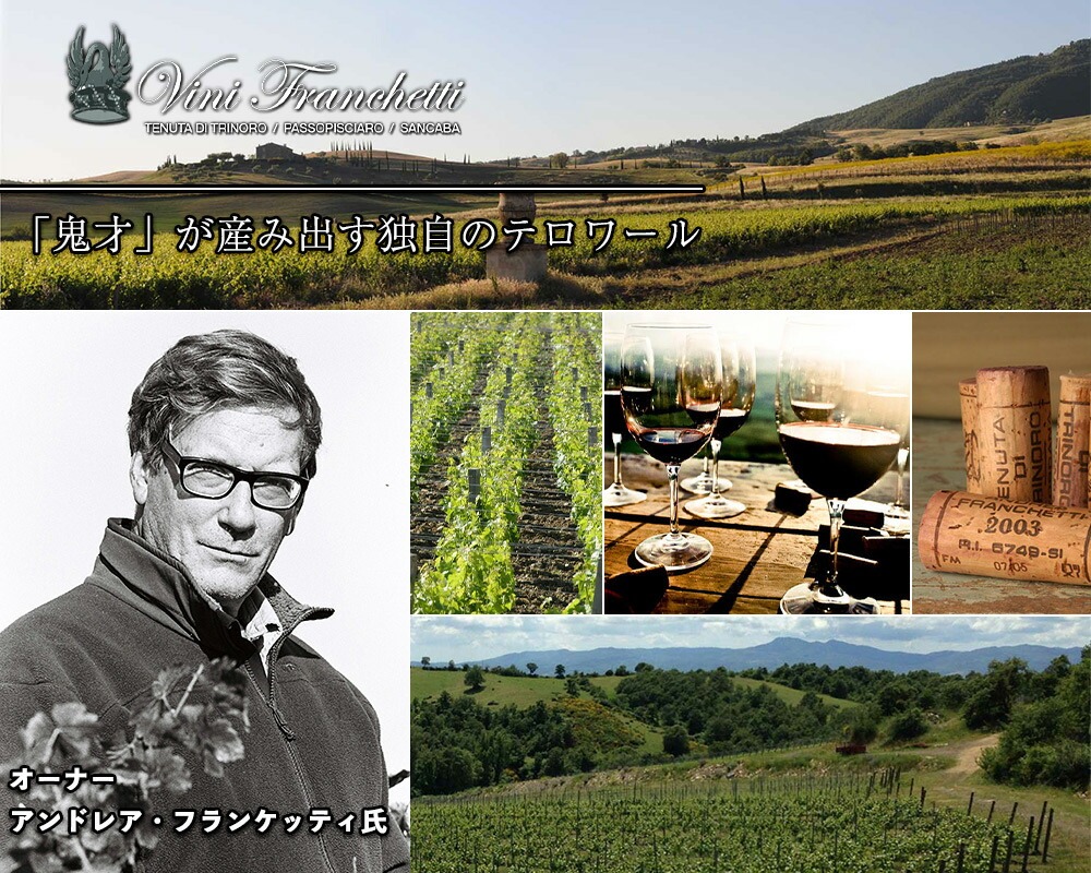 ![]() 「ワイナート12号」記事より抜粋トスカーナの誰も目もくれなかった サルテアーノという土地を、一躍有名にしたアンドレア・フランケッティ氏。土地を購入した当時をこう振り返る。「1980年頃、たまたま、サルテアーを訪れた時、まるで30年前にタイムスリップしたような昔のイタリアの田舎を感じたんだ。」そして91年からローマでの都会生活を捨ててここに移り住んだ。最初は2.5haからはじめ、醸造技術などは全て独学であり、ボルドーのシュヴァル・ブラン、ヴァランドローなどの友人達から学んだ。今では葉の色を見るだけでも、葡萄が今何をしているかわかるという。 ![]() 植樹はフランスの経験豊かな専門チームを呼び寄せ、出来るだけ小さい房、実をつけさせるため植密度をヘクタールあたり10,000株まで上げた。ワインはその土地、テロワールの凝縮、表現。微気候など色々な要素が関係してくるが、それら全てを含んだテロワールを表現する為にはこの植密度が大事だという。各小区画ごとでブドウの熟成度、質などが微妙に違う。収穫は、「今日はこの列からこの列まで」というふうに小区画で。醗酵も毎年40以上に分けている。「そのブドウに合った醗酵をしようとするとどうしても細かく分けないといけない。」 ![]() テヌータ・ディ・トリノーロについてヒュー・ジョンソン氏は「※トスカーナのモンテプルチャーノとモンタルチーノの間に位置するDOCのオルチャOrcia区域にぽつんとある葡萄園。(ボルドーの品種から)格別申し分ない赤を産する。テヌータ・ディ・トリノーロの初期の収穫年は驚くほどすごいもの。」と大絶賛! | ![]() ■ぶどう品種:カベルネ・フラン驚異の92%/メルロー8% ■発酵・熟成:オーク樽(225L)の新樽で8ヶ月熟成後、セメントタンクに移して11ヶ月以上熟成 ■収量:25hl/ha 入手困難!イタリア・トスカーナ・フルボディ辛口赤ワイン愛好家大注目!スーパータスカンファン垂涎!アンドレア・フランケッティ氏が2021年12月5日に逝去されました! なんと!初ヴィンテージの1997年から2015年まで(2002年を除き)ほぼすべてのV.Tで90点以上をマーク!2000年から2013年までは10のV.Tで95点以上をマーク! ワイナート誌も「トスカーナの底力を思い知らされる無名の地から登場した、驚異のワイン」として大特集! トスカーナの誰も目もくれなかったサルテアーノという土地をワイナリー「テヌータ・ディ・トリノーロ」の成功により一躍有名に! |