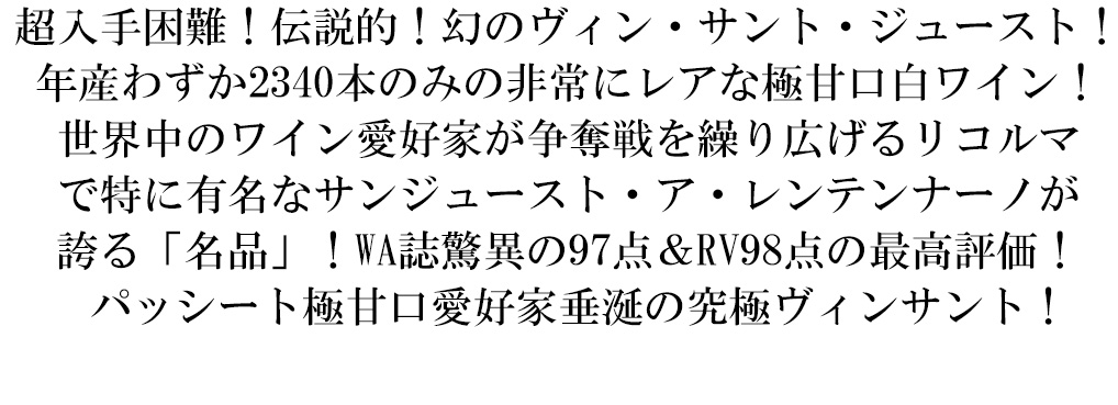 ![]() サンジュースト・ア・レンテンナーノは、DOCGキャンティ・クラシコのガイオーレ・イン・キアンティ地区の南部にあり、シトー派修道会の古い僧院だったという歴史あるワイナリーです。現在のキアンティの基礎となる造り方を築き上げたリカーゾリ男爵家の所有だったこの土地を、血縁のマルティーニ・ディ・チガラ家が継承。現在はルカ・マルティーニ氏が当主としてワイン造りを行っております。 ![]() サンジョヴェーゼ100%の最高傑作「ペルカルロ」の成功によってその名を世界に知らしめたサン・ジュースト・ア・レンテンナーノの成功は卓越したブドウ畑に因るものでした。この畑から生まれるワインは毎年ワインアドヴォケイトやアントニオガッローニなど名だたるワイン専門誌で高評価を獲得し、キアンティ・クラシコ地区の最も名高いワイナリーの一つとして、揺るぎない地位を築いています。 ![]() ワイナリーを構えるガイオーレ南部独特のテロワールは、7・8月は雨が降らず、気温も高い土地ですが、砂利層の表土の下に粘土層が適度に存在するので、渇水にならずにブドウが完熟します「ブルネッロ」を生むモンタルチーノ同様、極上ワインを生み出す最適な条件を備えています。 | ![]() ■ぶどう品種:マルヴァジア90%/ トレッビアーノ10% ■発酵・熟成:陰干しされたブドウを圧搾後、50Lの木樽に移し3年かけて発酵/ さらに同じ樽内で10年以上ゆっくりと熟成/ 完熟したブドウを手摘みし、風通しの良い部屋で約140日間棚干し/ モストは40~180リットルの栗の小樽に密封され、季節によって温度が変化するロフトに置かれ、ここでワインは発酵し、6年かけてゆっくりと成長/ その間に40%が蒸発するため、並外れた凝縮感が生まれる ■収穫:手摘み 超入手困難!伝説的!イタリアワイン愛好家だけでなく世界のワイン愛好家垂涎!イタリア・トスカーナ州からレアワイン!ヴィン・サント愛好家!パッシート極甘口愛好家大注目! 造り手はトスカーナ産メルロの最高傑作&最高峰と言われるカステッロ・ディ・アマの「ラッパリータ」とオルネッライアの「マッセート」と並び称されるワイン!特にリコルマは世界中のワイン愛好家にとって毎年このワインの争奪戦が繰り広げられるほどのラ・リコルマで有名なテヌータ・サンジュースト・ア・レンテンナーノの元詰限定品! 非常に人気で高評価のもう一つの入手困難なワイン!ワインアドヴォケイト誌、ラファエル・ヴェッキオーネが高評価!!気が遠くなるほどの歳月(樽内だけでも驚異の6年以上)をかけて造られる濃厚な味わいの高級ヴィン・サント! ヴァン・サント・ジュストは長期熟成のポテンシャルを持つワイン愛好家垂涎の究極ヴィンサントが正規品で限定極所y量入荷! |