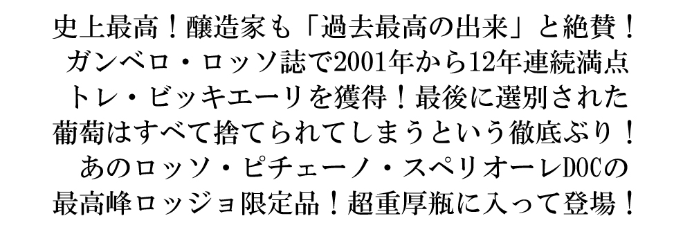 ![]() ヴェレノージは、イタリアのアドリア海沿岸のほぼ中心に位置するマルケ州のアスコッリ ピチェーノ地方でワイン造りを行う、注目を集める生産者です。父の自家用のワイン造りを小さい頃から手伝っていたエルコレが、抑えきれない情熱と共に始めたワイン造りは徐々に拡がり、現在では105haもの葡萄畑となりました。かつては「無口な職人エルコレ」というイメージでしたが、今は20名の若いスタッフが協力して品質向上に努めるチームとなっています。エルコレはテイスティングやワインの総合管理を行い、個々のワインには担当者がいて、全ての決定はスタッフ全員でしています。 ![]() 2002年6月から、トスカーナ出身のトップエノロゴ、アッティリオ・パリをコンサルタントに迎えました。ロバート・パーカー氏は「ワインアドヴォケイト#152」で、アッティリオ・パリの参加について『重要な動き』として言及し、『マルケ南部のリーダー的生産者となりつつあることを確信している。』と書いています。日当たりのよい斜面の畑から注意深くデリケートに栽培された葡萄を、各ワインのタイプにとって、最もアルコール含有量が適当となる糖度の時期に収穫します。また、ワインへの醸造は生産サイクルの重要なプロセスです。畑での作業の結果を十分生かすため、コンピュータ管理された温度コントロールした醸造方法、ソフトでデリケートなダメージをもたらさないプレス、ワインの種類によって様々なサイズや種類のステンレスタンクやオーク樽を使い分ける熟成が、色、味、ブーケ、アフターがパーフェクトなバランスの品質につながります。 ![]() エルコレのワインはすでに国内外で高く評価され、ヒュー・ジョンソン氏の「ポケットワインブック」ではロッソ ピチェーノの最良の生産者として、イタリアワインのガイドとして名高い「ガンベロ ロッソ」でも好評価を得ています。ほとんどのイタリアワインが集う展示会ヴィニタリィの品評会や、その他国内外の品評会でも毎年のように受賞しています。イタリアのプレステージ ブランド「ドルチェ & ガッバーナ」がミラノに開いたリストランテ「ゴールド」にも、ロッジョ・デル・フィラーレとルディがオンリストされています。 | ![]() ■発酵:ステンレスタンクで発酵させます!醸しは約28日間 ■熟成:フランスのメーカー ベルトミューのバリック(新樽も使用)で18ヶ月熟成 ■土壌:石灰岩の混じった粘土質土壌 超人気!イタリア辛口フルボディ赤ワイン愛好家垂涎!ヴェレノージの造るワインの中で最も多くの賞を受賞したフラッグシップワイン!ロッソ・ピチェーノの単一年産100%のフルボディ辛口赤ワイン! ベリー系の果実の複雑で広がりのある上品な芳香、しっとりした果実の深い味わいとエレガントな深みのある力強さを持っています!ボトルデザインは有名なカルドッチの詩から取っています! 長期熟成のあとリリース!ロッソ・ピチェーノの数ランク上の、スペリオーレの中心の畑の名が付けられた、広がりのある上品な芳香! しっとりとした果実の深い味わいとエレガントな深みのある力強さをもつ最高評価の究極フルボディ赤ワインが限定で極少量入荷! |