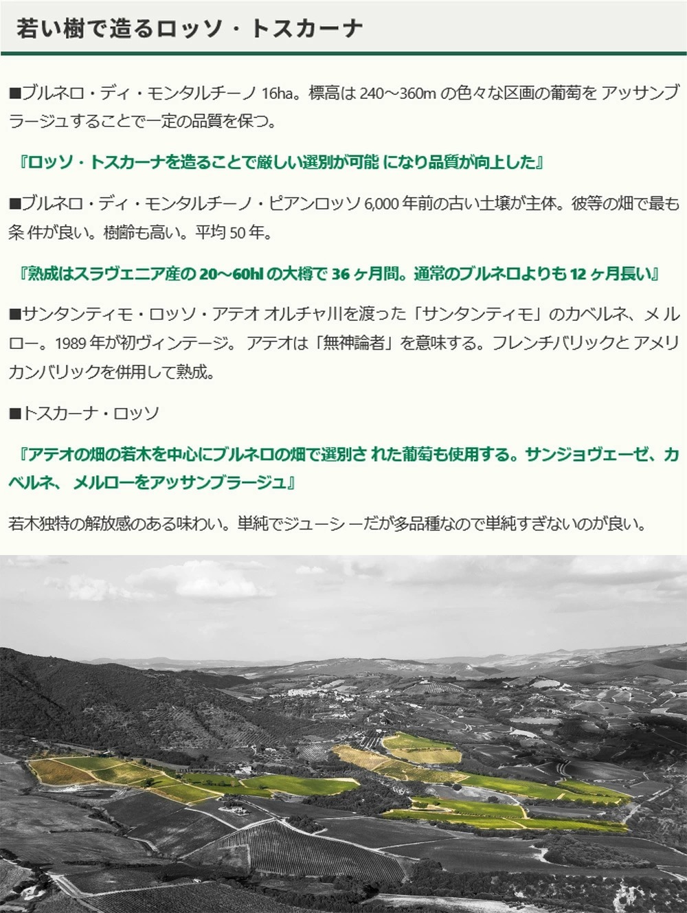 ![]() ビッグネームが揃うブルネロ・ディ・モンタルチーノDOCGの中でその独特の味わいと比類なき完成度で存在感を示すのがチャッチ・ピッコロミーニ・ダラゴナ。 シエナの南10km程田舎道を進んでいくとモンタルチーノの丘がぽっかりと現れる。 世界的に有名な産地のわりには飾り気のない素朴な街並みで130を越える生産者がひしめきあう周辺のなだらかな丘陵部分は見渡す限り葡萄とオリーヴが占領している。 更に南に進んだモンタルチーノの南端カステルヌォーヴォにチャッチ・ピッコロミーニ・ダラゴナは位置する。また2003年より新たな試みとしてIGTトスカーナ・ロッソが発売された。 アテオの畑の若木を中心にサンジョヴェーゼ、カベルネ、メルローをアッサンブラージュ。 若木ゆえに若いうちから開き、楽しめるが、流石に素晴らしい完熟度。 チャッチ・ピッコロミーニらしさを感じさせる。 ![]() ガレストロ土壌が広がるモンタルチーノにおいて、ここは少し特異な土壌になっていて白いガレストロに赤い粘土質が混ざりこみ、鉄分、マグネシウムの比率が周りの土壌と比べて格段に高くなっている。この特殊な土壌がチャッチ・ピッコロミーニ・ダラゴナのスタイルを独特のものにしていることは明らか。標高は240~360m程度。オルチァ川の影響もあり日中は陽光が強く、夜間は冷え込みが強い理想的微気候となっている。 ![]() チャッチ・ピッコロミーニ・ダラゴナの歴史は古く、起源は17世紀に遡る。1985年にはジュゼッペ・ビアンキーニ(現オーナー一族)に引き継がれ、一気に品質志向を強めていくこととなる。 セラーは改築され最新鋭の設備が整い、醸造責任者にはロベルト・チプレッソを起用した。この改革後数年で最高の評価を得て、一気に人気ワイナリーの仲間入りを果たした。現在ではジュゼッペから息子パオロと娘ルチアに引き継がれ、醸造責任者もパオロ・ヴァッカジーニとなって、更に安定感を増している。畑では有機栽培が実践され防虫剤、防カビ剤は勿論、除草剤も使用しない。(一部ボルドー液、銅、硫黄化合物は使用する)収量も厳しく制限され法定基準の3/4まで抑えられている。フラッグシップであるブルネロ・ディ・モンタルチーノ・ピアンロッソはモンタルチーノの南西端に位置する単一畑ピアンロッソ(11.6ha)100%でオルチァ川に南向きに面している。粘土と石灰が混ざりあった泥灰土壌で標高360m。熟成はスロヴェニア産の大樽で36ヶ月間行われる | ![]() イタリア辛口フルボディ赤ワイン愛好家大注目!個性派ブルネッロの最高峰! ロバート・パーカー満点5つ星生産者!でもある、チャッチ・ピッコロミニ!のこのワインがすごいことに! なんと毎年一万数千本の中から選ばれ、入選することも難しいと言われる、ワインスペクテーター誌の2012年度の年間TOP100のトップ第9位に、ブルネッロの2007年ヴィンテージが入選! 赤と紫のベリー系果実のプレリュードが即座に強烈さと複雑さをもたらし、その後にタール状のスパイス、キャンプファイヤーの灰、甘草、錆びた爪が続きます。 高評価続出2018年のダラゴナの高級ブルネッロ!究極フルボディ辛口赤ワインが限定で極少量入荷! |