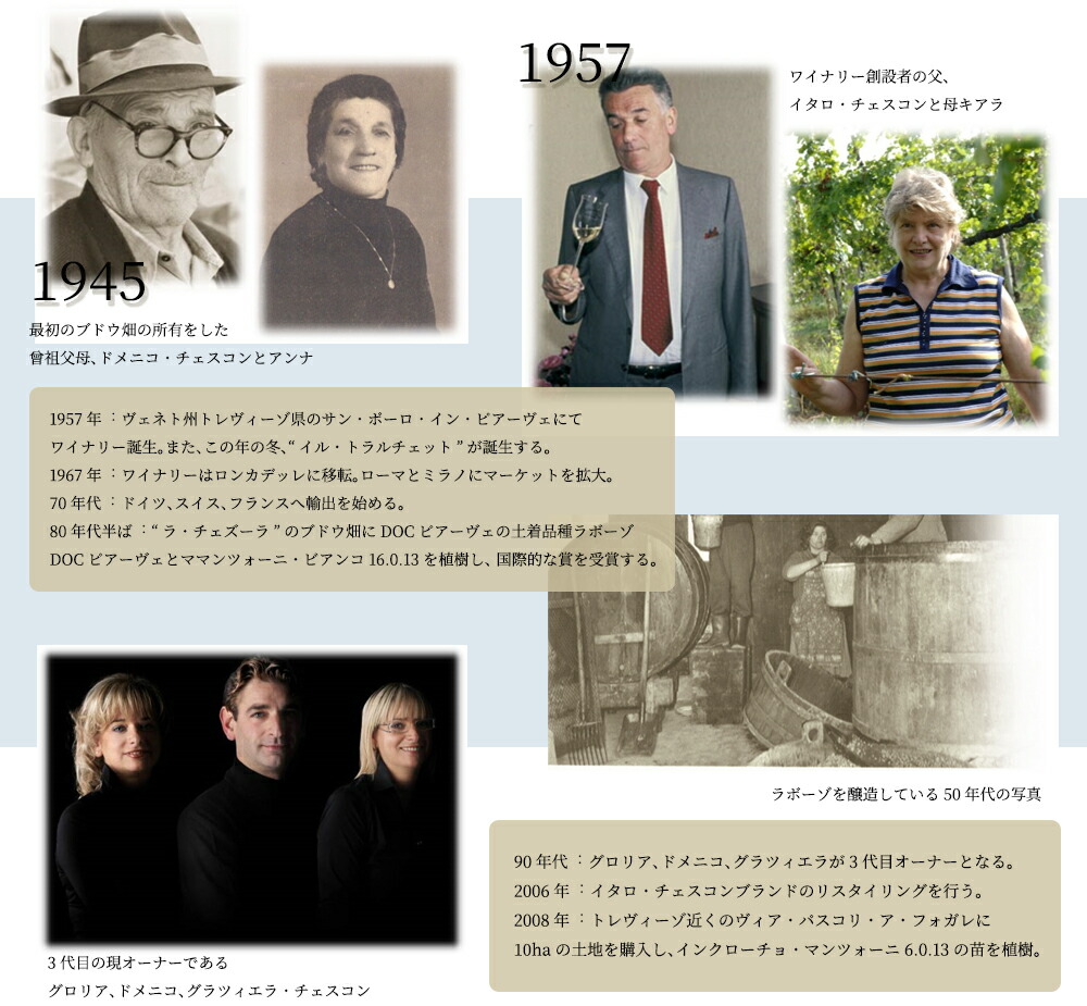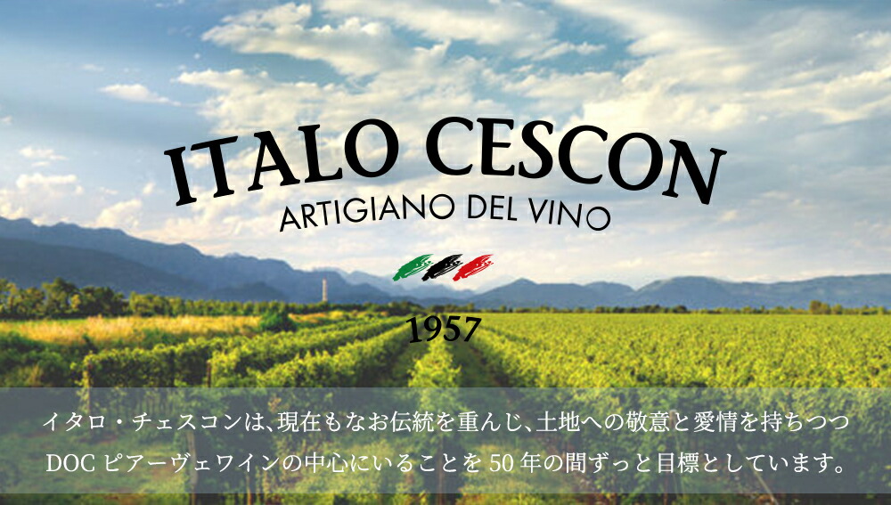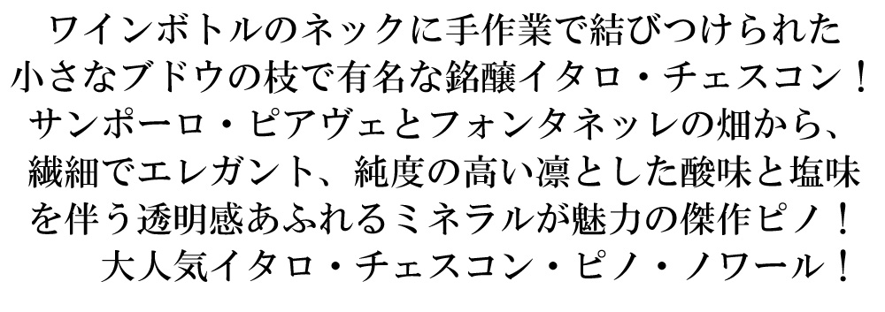 イタロ・チェスコン社はヴェネト州トレヴィーゾ市近郊に、1957年に設立された家族経営のワイナリーです。シンボルとなっているワインボトルにブドウの小枝を結び付けるアイディアは現オーナーの祖母アンナが考えたものです。彼らのワイン造りに対する信念は設立時から変わらず、研究と開発を継続して、地域の文化と融合し、自然を敬いながら最高のワインを造ることです。 | ![]() ■ぶどう品種:ピノ・ノワール 100% ■発酵・熟成:マロラクティック発酵、セメントタンクで6ヶ月間熟成 ■ 葡萄畑面積:95ha(DOCピアーヴェ地区) イタリア辛口白ワイン愛好家大注目!ピノ・グリージョファン大注目!2008年11月のデカンタ誌で「ベストヴァリュー白ワイン」に選出された実績もあるお勧めのピノ・グリージョ!ワインボトルのネックに手作業で結びつけられた小さなブドウの枝であまりに有名なカンティーナ「イタロ・チェスコン」! 造り手のイタロ・チェスコンは1957年に設立された家族経営のワイナリー!シンボルとなっているワインボトルにブドウの小枝を結び付けるアイディアは現オーナーの祖母アンナが考えたもの!彼らのワイン造りに対する信念は設立時から変わらず、研究と開発を継続して、地域の文化と融合し、自然を敬いながら最高のワインを造ること!国際レベルの賞を受賞するワインを生産! |