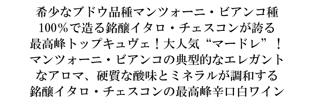 イタロ・チェスコン社はヴェネト州トレヴィーゾ市近郊に、1957年に設立された家族経営のワイナリーです。シンボルとなっているワインボトルにブドウの小枝を結び付けるアイディアは現オーナーの祖母アンナが考えたものです。彼らのワイン造りに対する信念は設立時から変わらず、研究と開発を継続して、地域の文化と融合し、自然を敬いながら最高のワインを造ることです。 | ![]() ■発酵・熟成:コンクリートの容器で発酵後、樽に移され3月まで酵母とともに熟成。瓶内熟成は最低1年以上。シュールリー製法 ■土壌:粘土質 ■栽培:オーガニック畑 ■収穫:9月初旬 ■地形:ピアーヴェ川岸にある平地 ■葡萄畑面積:95ha(全てのブドウ畑を含む) 非常に希少なブドウ品種マンツォーニ・ビアンコ種100%で造るイタロ・チェスコンが誇る白の最高峰トップキュヴェ! マンツォーニ・ビアンコの典型的なエレガントなアロマを持つワイン! 黄桃、アカシア、ライムピールとアロマティックなハーブの香りは熟成とともにミネラルや塩味を生み出します!フレッシュで生き生きとしたエレガントな口当たりで、バランスのとれた酸が特徴の一度飲んだら忘れることができない個性を持った究極辛口白ワイン! 甲殻類を含む魚介料理、白身肉料理、サラミやハーブの入ったチーズとの相性抜群! |