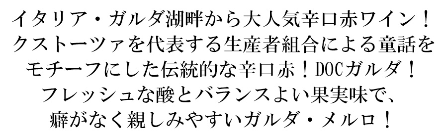 クストーツァを代表する生産者組合カンティーナ ディ クストーツァは1968年に設立されたこのエリアを代表する生産者組合です。設立当初は83軒の栽培農家しかいませんでした。1971年にクストーツァのファーストヴィンテージの生産を始めました。この年は、ちょうどクストーツァがDOCに認定された年でもあります。これはカンティーナ ディ クストーツァにとってこの土地の歴史を大きく変える転機となりました。現在、組織は大きく発展し、200軒の栽培農家から構成され、全体で1,000haの畑で葡萄を栽培しています。 畑は主にガルダ湖の南東の斜面に位置しています。伝統を重んじながらも革新的な技術を取り入れ、その土地の個性が表現されたワイン造りを行っています。単なるワインとしてではなく、グラスを傾ける度に、葡萄を育てている人々の土地や伝統への情熱や愛情が飲み手に伝わるようなワインを目指しています。 童話をモチーフにした印象的なラベルカンティーナ ディ クストーツァの「イ クラッシチ」シリーズはクストーツァのエリアで昔から造られてきた伝統的なワインのシリーズで、どんな食事にも寄り添う、調和のとれたフレッシュな味わいを持っています。ラベルには、時代を超えて愛されるこれらのワインと同様に、時代を超えて多くの人々に読み継がれている童話をモチーフとしています。クストーツァは「しっかり者のスズの兵隊」、ピノ グリージョは「ジャックと豆の木」、バルドリーノ キアレットは「ピノッキオの冒険」、バルドリーノは「赤ずきん」、ガルダ メルロは「ブレーメンの音楽隊」、ロッソ デル モリーノは「三匹の子豚」がモチーフになっています。 | ![]() ■ぶどう品種:メルロー100% イタリアワイン愛好家大注目!ブレーメンの音楽隊がモチーフで可愛いラベルのメルロー100%辛口赤ワインが入荷! ラベルには、時代を超えて愛されるこれらのワインと同様に、時代を超えて多くの人々に読み継がれている童話をモチーフとしており、 「ガルダ・メルロ」のラベルには、グリム童話の物語の一編である「ブレーメンの音楽隊」がモチーフとなった絵が描かれています! 濃いルビーレッド、煮詰めた赤い果実の甘い香りが広がり、口当たりは軽やかで、フレッシュな酸が心地よく、ほどよいタンニンが感じられ、とてもバランスの良い味わいです! ガルダ湖の南西の畑で造る親しみやすいメルロ「ガルダ メルロ」、リーズナブルな価格も魅力的です! |