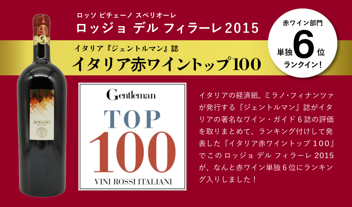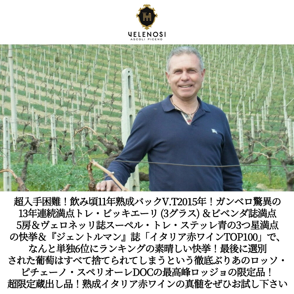 【商品説明】入手困難!イタリア辛口フルボディ赤ワイン愛好家大注目!あの『神の雫』にも登場!入荷即完売のあの大人気フルボディ辛口赤ワインの希少熟成バックヴィンテージ[2015]年ものが超限定で少量入荷!しかも貴重な10年熟成作品がついに限定入荷! なんと!このワインで三大イタリアワイン評価誌すべてで満点評価獲得!ガンベロ・ロッソ誌でトレ・ビッキエーリ (3グラス) 満点! (なんと!ガンベロロッソ誌驚異の13年連続満点トレ・ビッキエーリ (3グラス) ) !ヴェロネッリ誌スーパー・トレ・ステッレプラス (編集長ダニエレ チェルニッリが感銘を受けたワイン) 青の3つ星満点獲得!ドゥエミラヴィーニ5つ房 (チンクエ・グラッッポリ) 満点獲得!さらに「ルカ・マローニ ベストワイン年鑑2019」で驚異の97点の高得点をマーク!ロバート・パーカー ワインアドヴォケイト誌で高評価!ワイン&スピリッツ誌で高得点獲得! この2015年ヴィンテージが『ジェントルマン』誌 (イタリアのトップワイン・ガイド5誌 (「ガンベロ・ロッソ」「ヴェロネッリ」「ルカ・マローニ」「ドゥエミラ・ヴィーニ」「エスプレッソ」) の評価を取りまとめてランキングした「イタリア赤ワインTOP100」) で、なんとこのロッジョ・デル・フィラーレ2015が、赤ワイン部門で単独6位にランキング!の快挙!もちろんサッシカイアやオルネッライア等も含む6つの評価誌の全てで高得点を獲得しなければ、達成できない快挙です! ずばりヴェレノージのこのワインには、セカンドワインがなく、最後に選別された葡萄はすべて捨てられてしまうという徹底ぶり!ずばり石灰岩の混じった粘土質土壌の畑から収穫量を抑えた選りすぐりの葡萄をフレンチオーク樽のベルトミュー社のバリック ( (225Lの小樽の新樽100%) で18ヶ月熟成、瓶でも6ヶ月の計24ヶ月の長期熟成のあとリリース!ロッソ・ピチェーノのワンランク上の、スペリオーレの中心の畑の名 (ロッジョは「朱の、赤い」という意味で、炎のことを指しています。) が付けられた、色々なベリーをミックスした複雑で広がりのある上品な芳香!しっとりとした果実の深い味わいとエレガントな深みのある力強さをもつ究極フルボディ辛口赤ワインが超限定でしかも貴重な10年熟成の貴重なバックヴィンテージ[2015]年もので蔵出し作品の貴重な熟成作品の正規品で限定少量入荷! (若いヴィンテージでも美味しく楽しめるワインですが、10年熟成させることで深みが増し、複雑さとエレガントさが感じられるようになります。熟成イタリア赤ワインの真髄をぜひお確かめいただけましたら幸いです。)