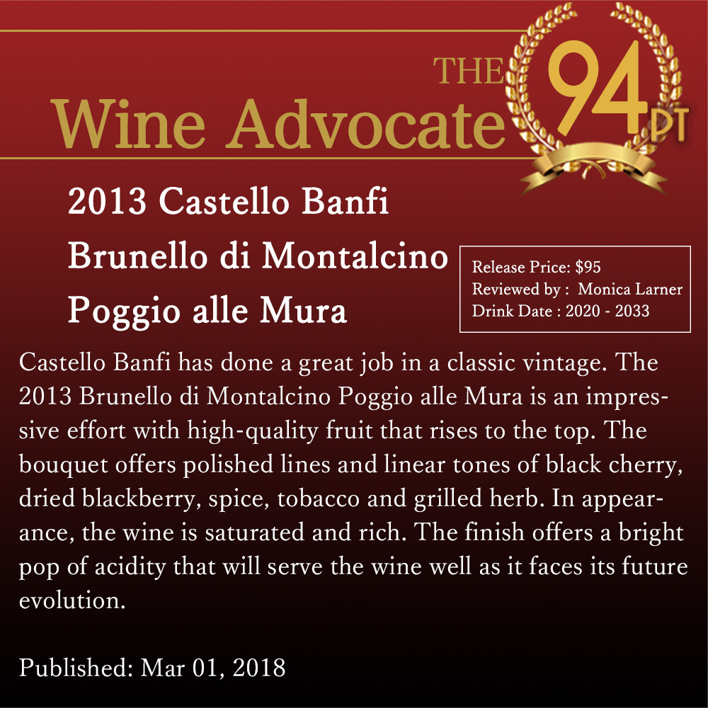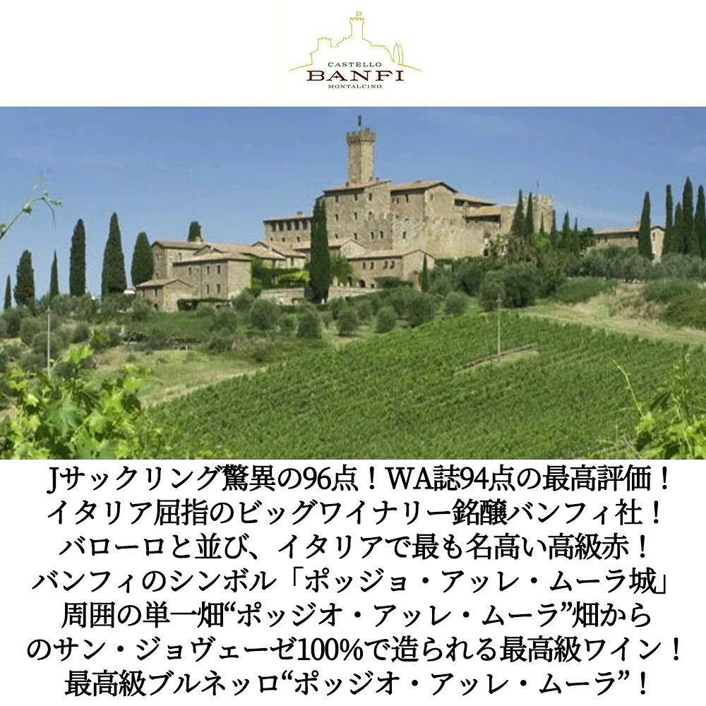 【商品名】ブルネッロ・ディ・モンタルチーノ“ポッジオ・アッレ・ムーラ”[2013]年・オーク樽24ヶ月熟成・カステッロ・バンフィ元詰・単一畑産100%・DOCGブルネッロ・ディ・モンタルチーノ・正規代理店輸入品・ジェームス・サックリング驚異96点・ワインアドヴォケイト誌驚異の94点・ビベンダ5グラッポリ獲得ワイン・フルボディ・赤・飲み頃12年熟成品【英名】Brunello di Montalcino Poggio ALLE MURA 2013 Castello BANFI DOCG Brunello di Montalcino