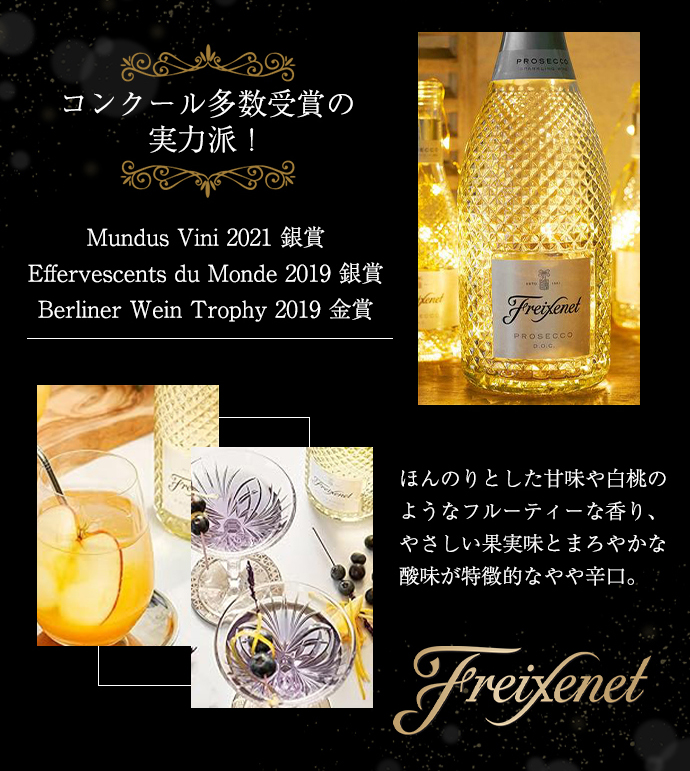 ■ぶどう品種:グレーラ種100%■発酵・熟成:カヴァとは異なる専用酵母を用い、発酵を行っています。 世界の高級スパークリングワイン愛好家大注目!プロセッコファン大注目!フレシネ社のロゴ入りグラス付きの限定ボックスが遂に登場! 世界No.1売上スパークリング(ベストセラーワイン)スペイン高級シャルマ方式(タンク内二次発酵)で造られる究極辛口黒ボトル(印象的な黒ボトルで世界を魅了)であまりに有名なフレシネから新たな挑戦! プロセッコらしいほんのりとした甘味や白桃のようなフルーティな香り!やさしい果実味とまろやかな酸味が特長的! アルコール度数も低め(11%)で、プロセッコらしいドリンカビリティの高さが印象的!ドサージュ17g/Lのエクストラ・ドライ!カッティングボトルが美しく輝く、フレシネのプレミアム品! |