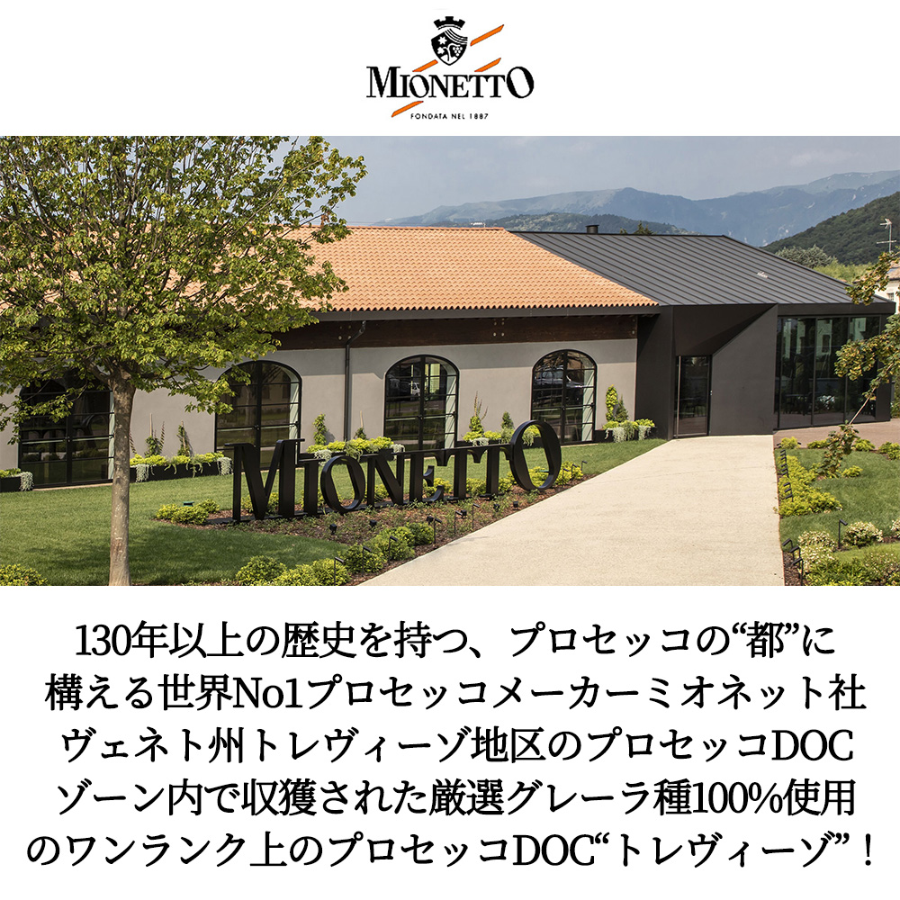 【商品説明】イタリア辛口スプマンテ愛好家大注目!イタリア辛口スパークリング愛好家大注目!しかもグレーラ種 (プロセッコ種) 100%!しかもヴェネト州トレヴィーゾ地区のプロセッコDOCゾーン内で収獲されたグレーラ種100%使用! 造り手は、130年以上の歴史を持つプロセッコの“都”に構える世界No.1プロセッコメーカー (IWSR 2018 International brandにおいて) であるミオネット社!1887年フランチェスコ・ミオネットによりプロセッコの“都”ヴァルドッビアーデネで創業!2008年からはヘンケルグループに入り、世界約70カ国に販売するグローバルプロセッコメーカーの一つに!2009年にプロセッコがDOC認証され、ぶどう栽培地域が拡大されたが、ミオネットは以前よりプロセッコが、生産されていたトレヴィーゾ県ヴァルドッビアーデネでワイン造りを続けているミオネット社のフラッグシップ! こだわり究極プロセッコ!通常DOCよりワンランク上のプロセッコDOC“トレヴィーゾ”!軽やかな白い花、フレッシュなリンゴ、やさしい果実味とふんわりとした泡立ち!やわらかな味わいの後のホロ苦さが程よく引き締める!素直でプロセッコらしい味わいのミオネット・プロセッコ・ブリュットが限定で少量入荷!